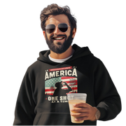 Celebrate Independence Day with our Celebrating America One Shot at a Time hoodie. Featuring the silhouette of a man drinking a shot with a distressed American flag in the background, this hoodie is perfect for 4th of July festivities, cool summer nights, and casual outings. Made from high-quality material, it offers comfort and style while showcasing your patriotic spirit.