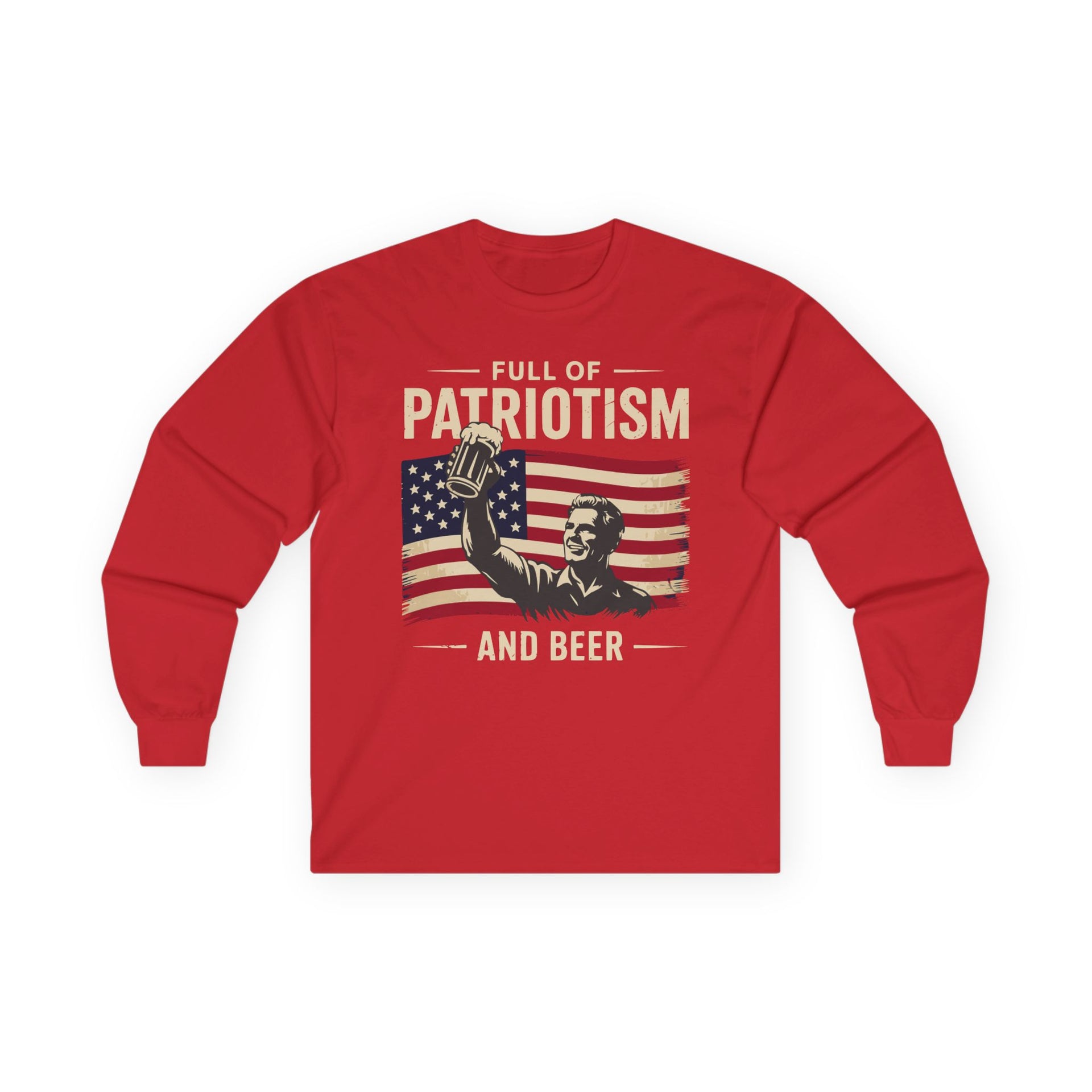 Toast to freedom and good times this Independence Day with bold typography proclaiming Full of Patriotism and Beer against a distressed flag backdrop and a striking silhouette of a man raising his beer. Crafted from heavyweight cotton, this long-sleeve tee delivers structure, comfort, and durability for every festive moment.