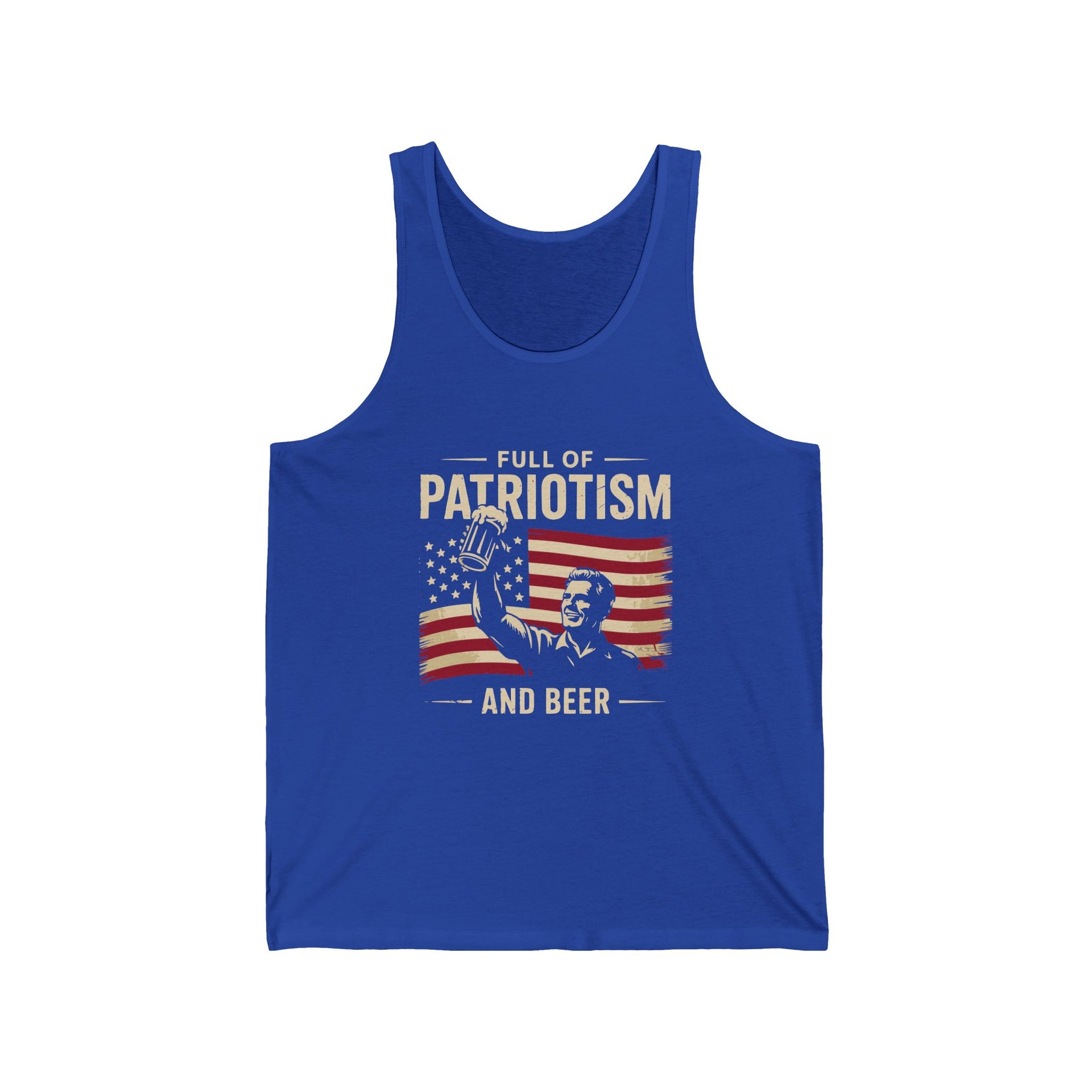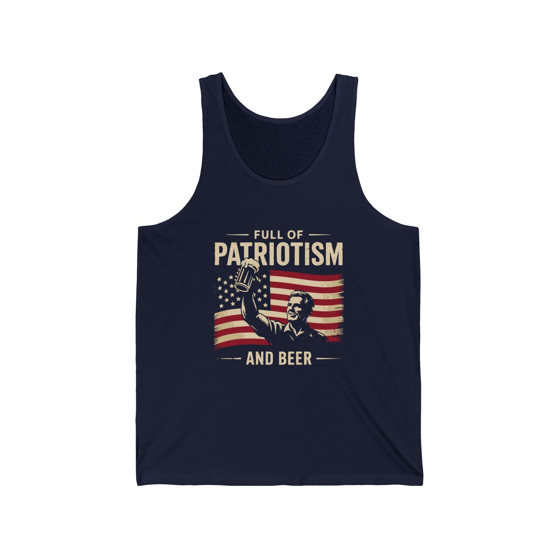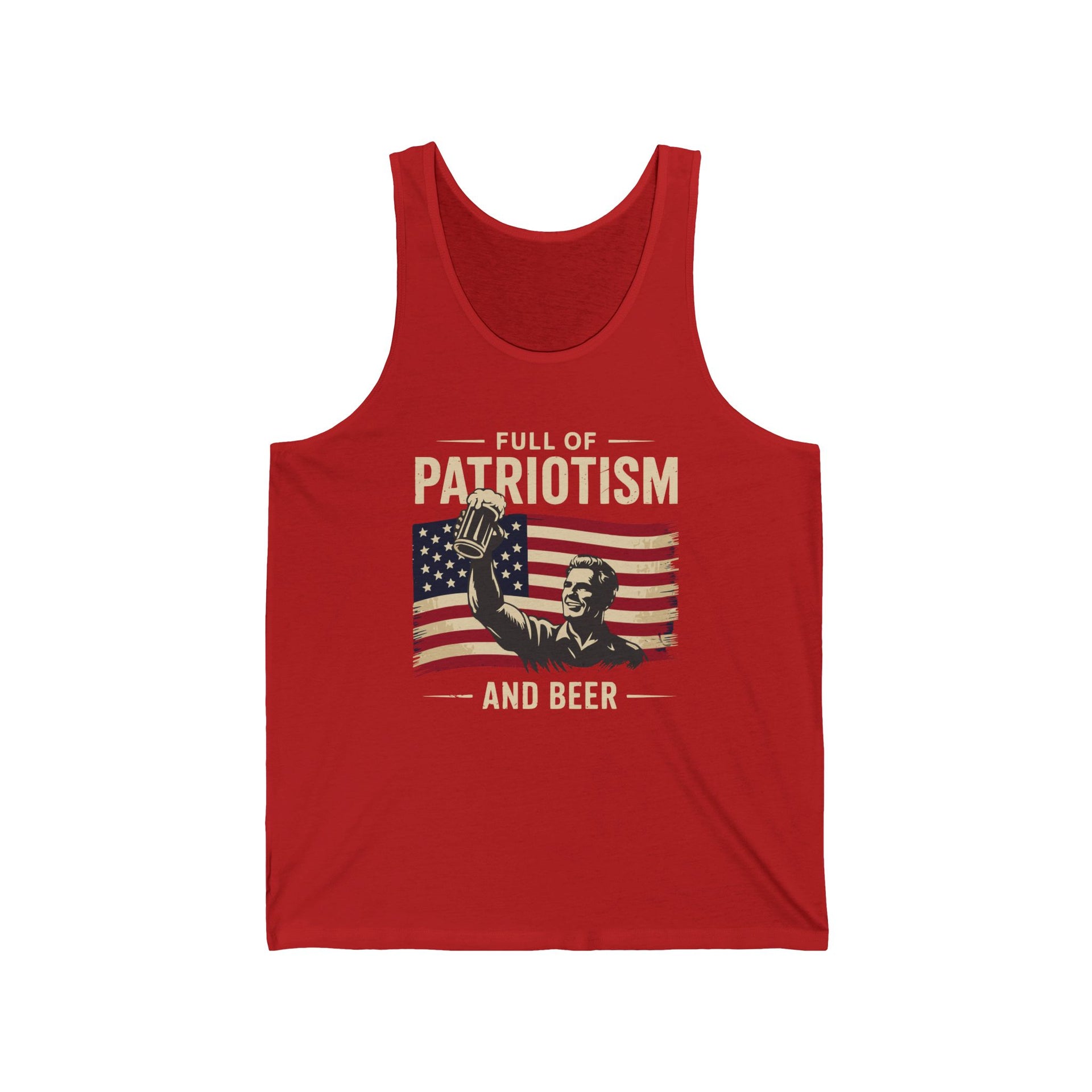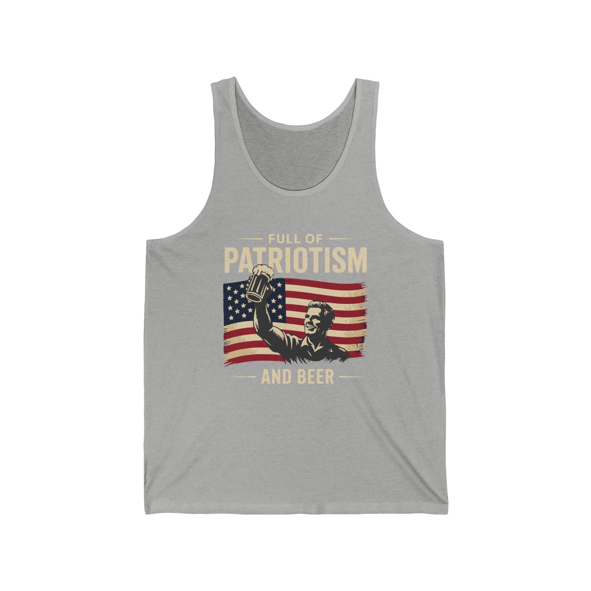 Get ready to celebrate Independence Day with bold typography that reads Full of Patriotism and Beer set against a distressed flag backdrop and a silhouette of a man raising a cold one. Crafted from ultra-soft cotton jersey, this unisex tank combines festive flair with lightweight comfort—perfect for summer parties and beer-loving celebrations.