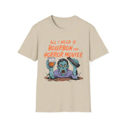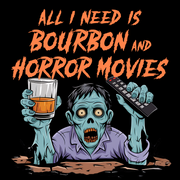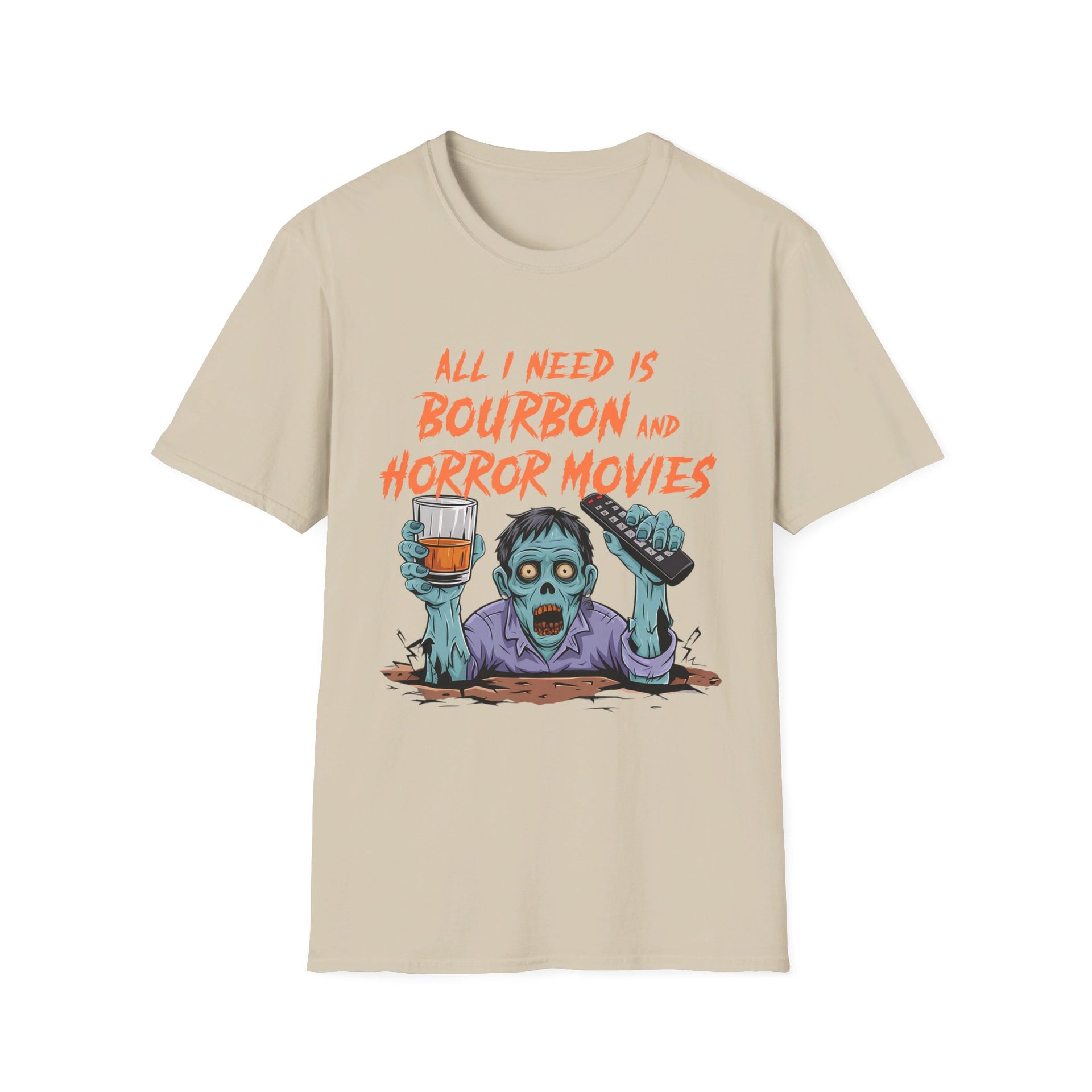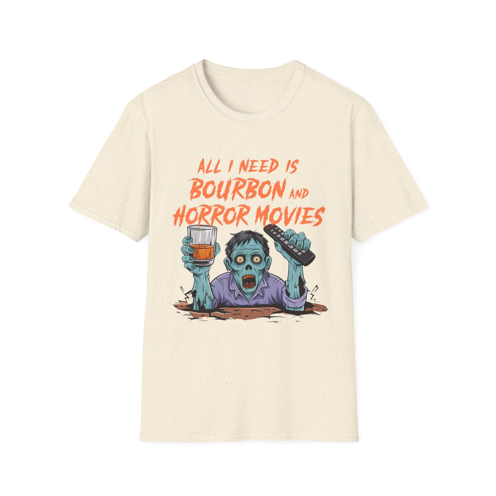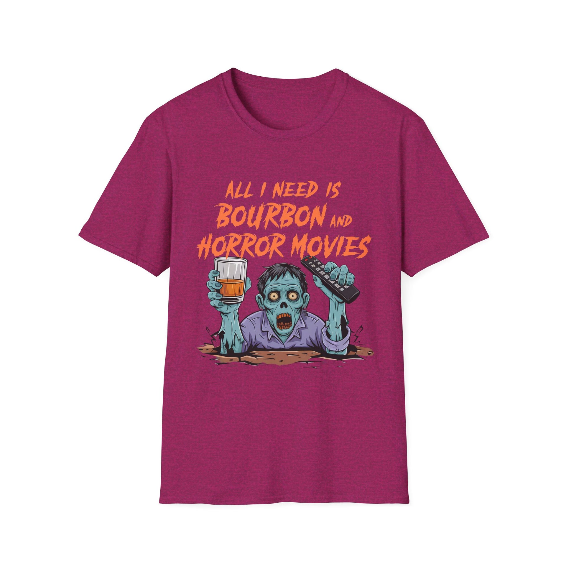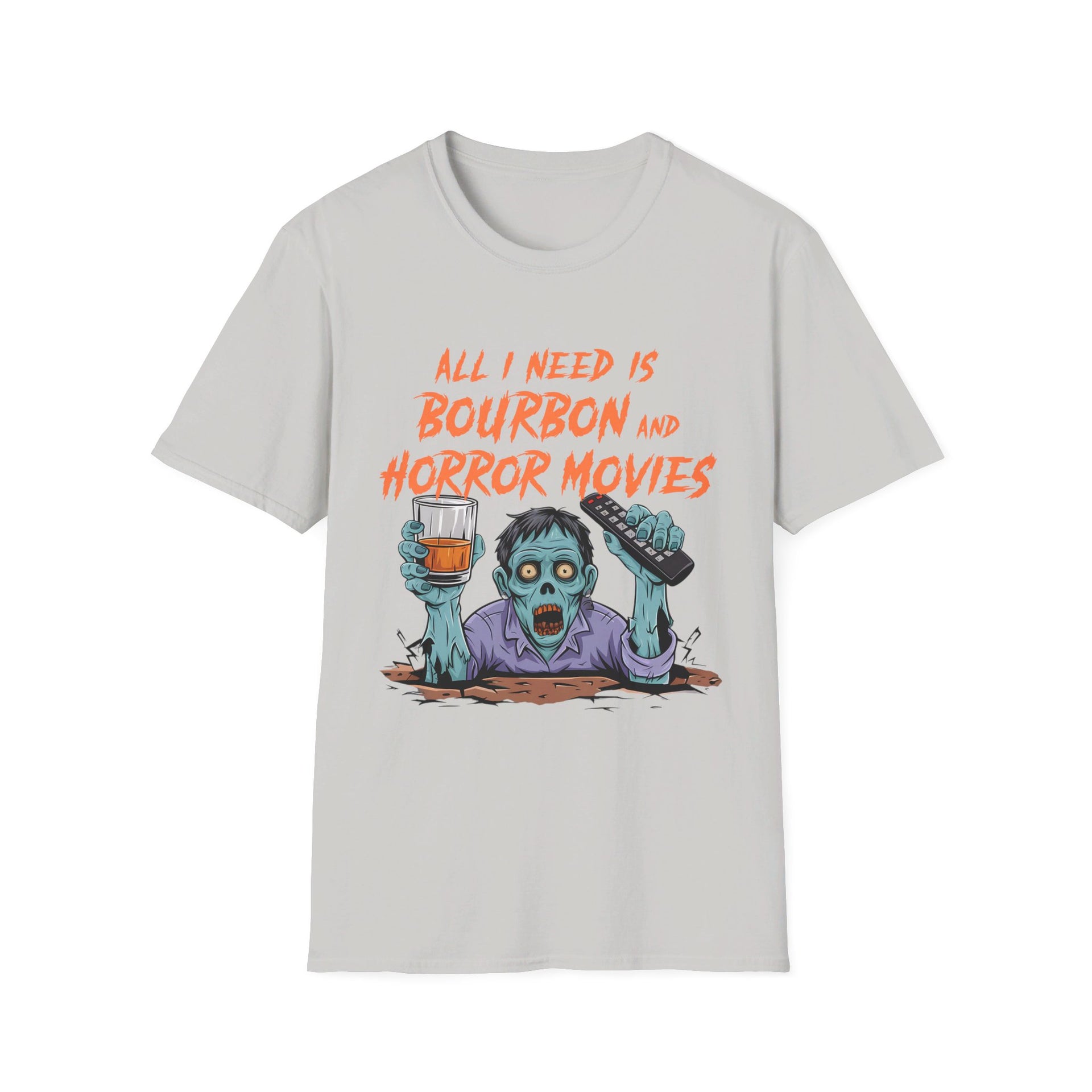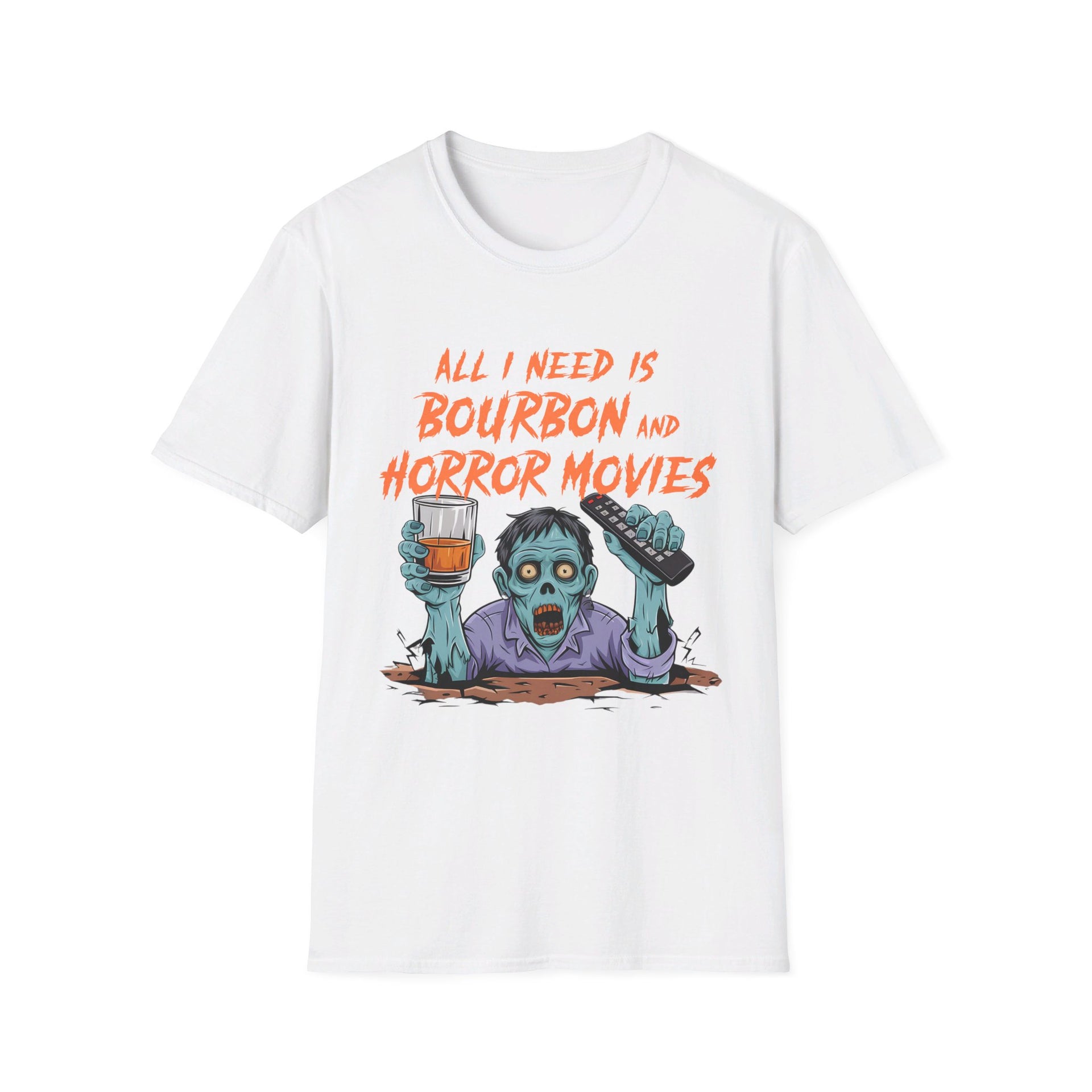 Get ready for a frightfully good time with this Halloween tee—because all you need is bourbon and horror movies!