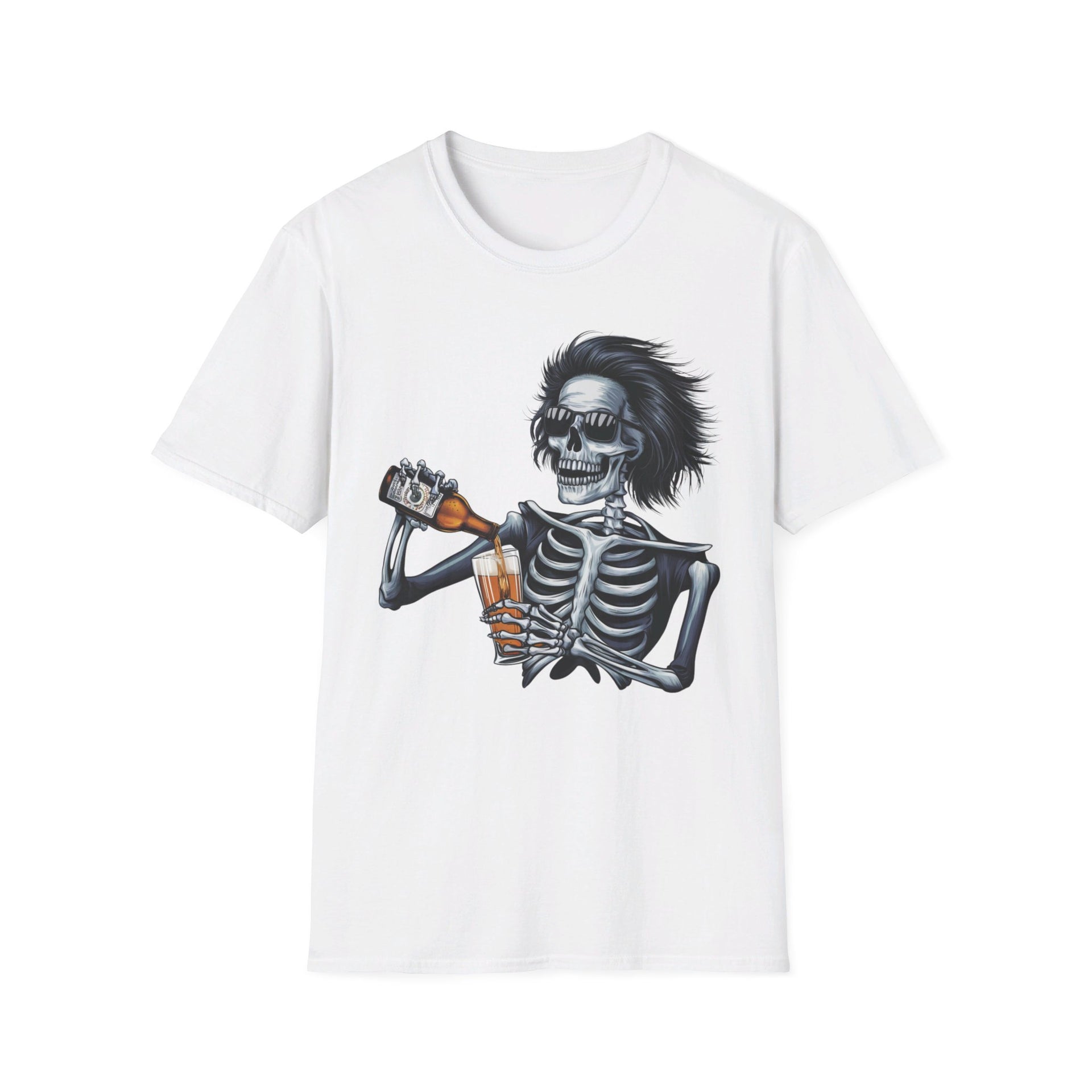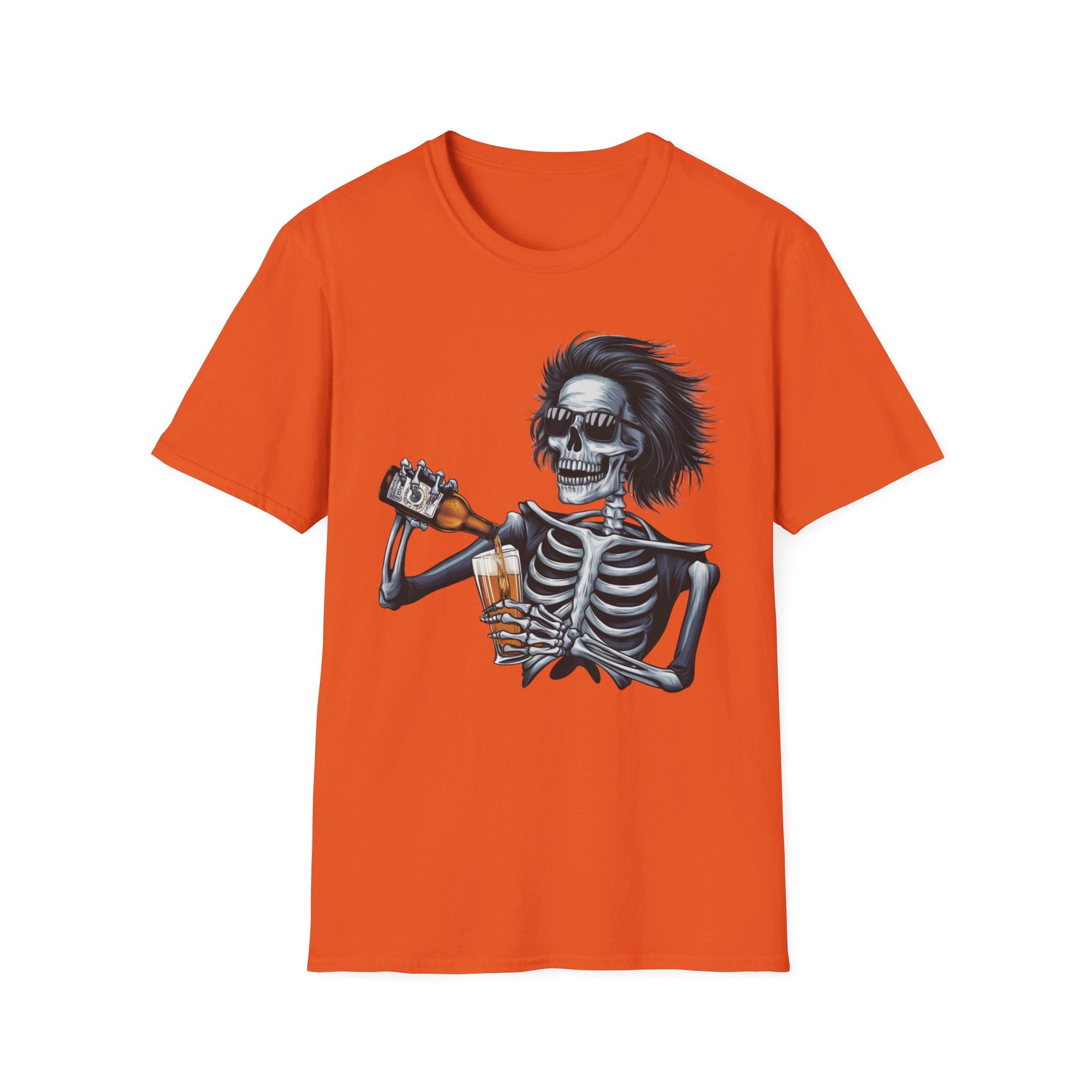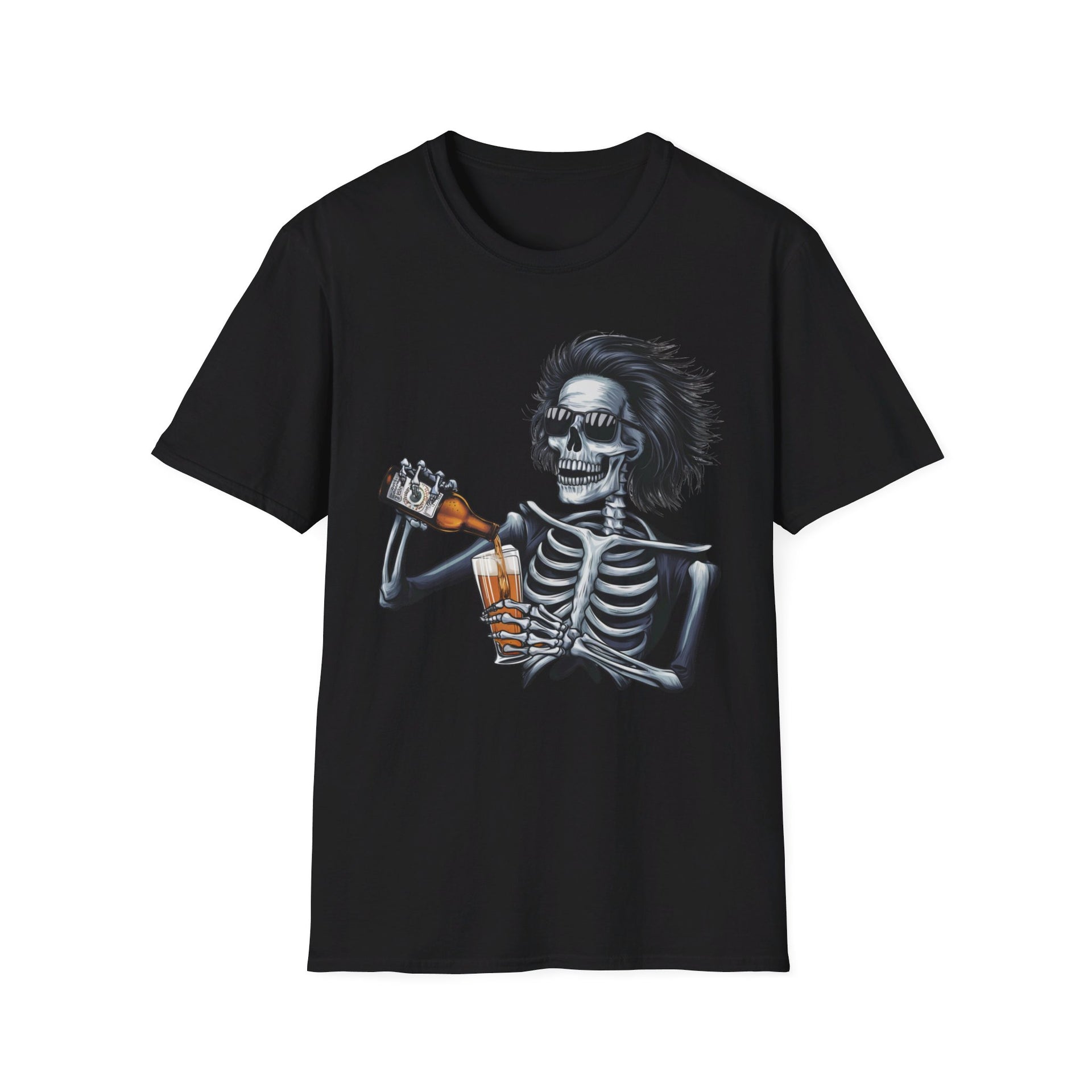 Embrace the chill vibes of Halloween with this cool skeleton tee—perfect for those who like their style laid-back and their beer cold.