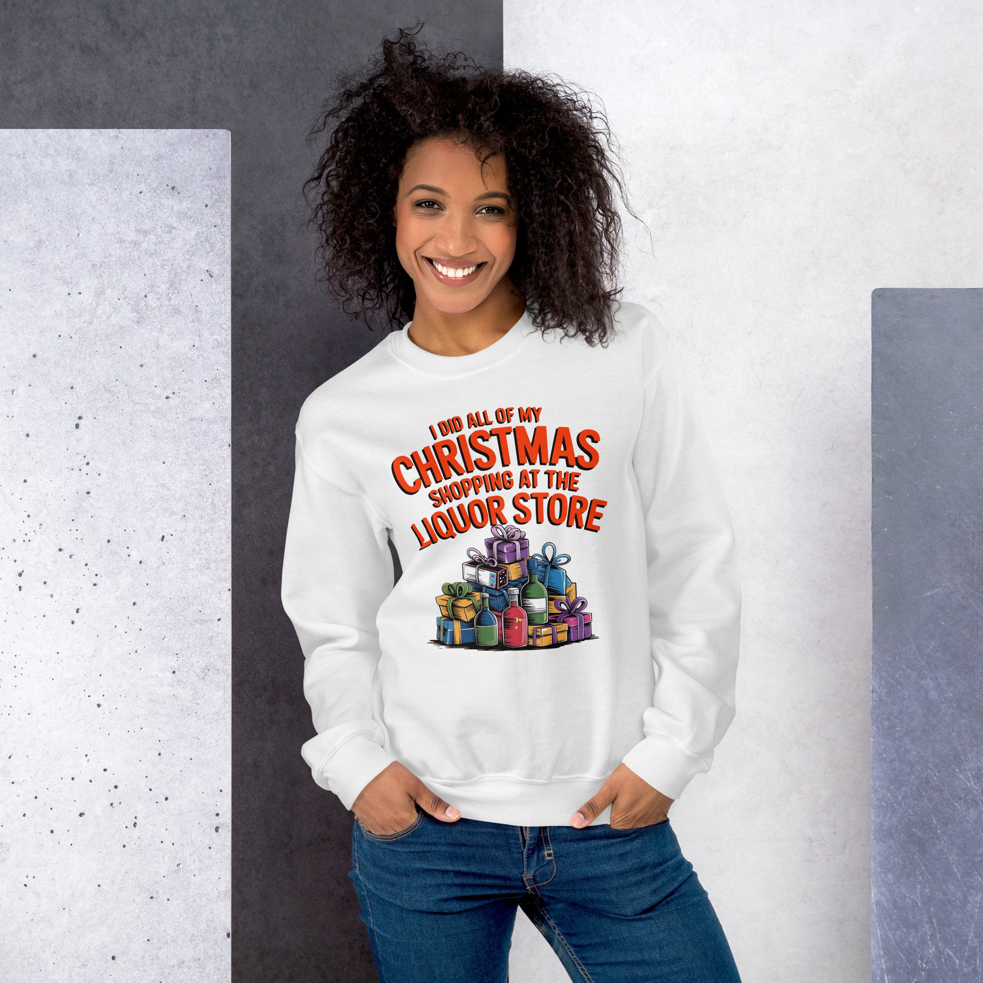 Show off your holiday spirit with a twist of humor! This cozy sweatshirt with the phrase "I did all of my Christmas shopping at the liquor store" is perfect for anyone who loves a good laugh and a festive drink. Ideal for holiday gatherings, gift exchanges, and Christmas parties!