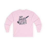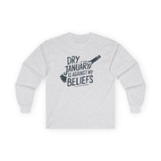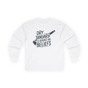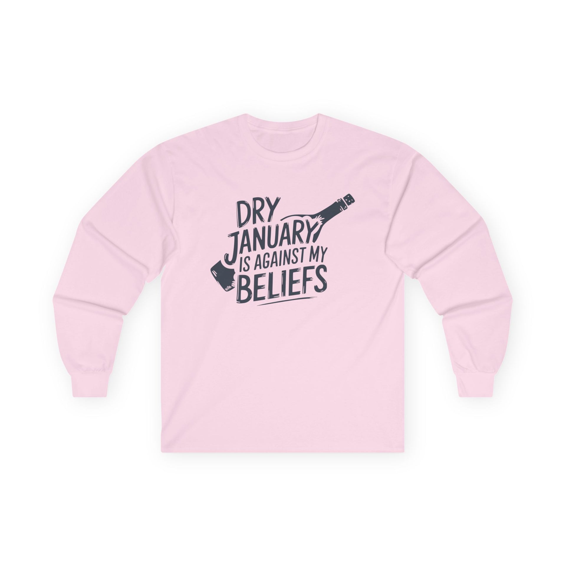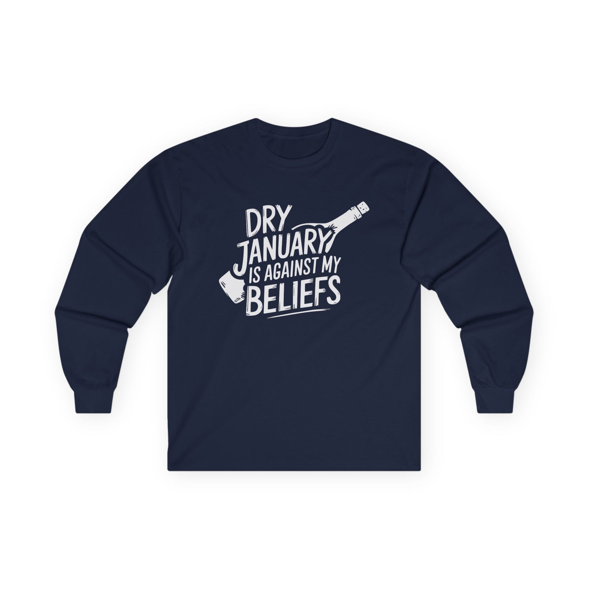 Dry January Is Against My Beliefs Long-Sleeve Shirt - Humor Apparel for Wine and Bourbon Lovers, Sarcastic Drinking Tee