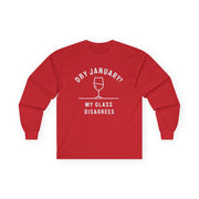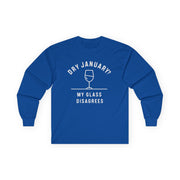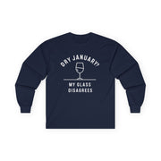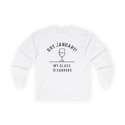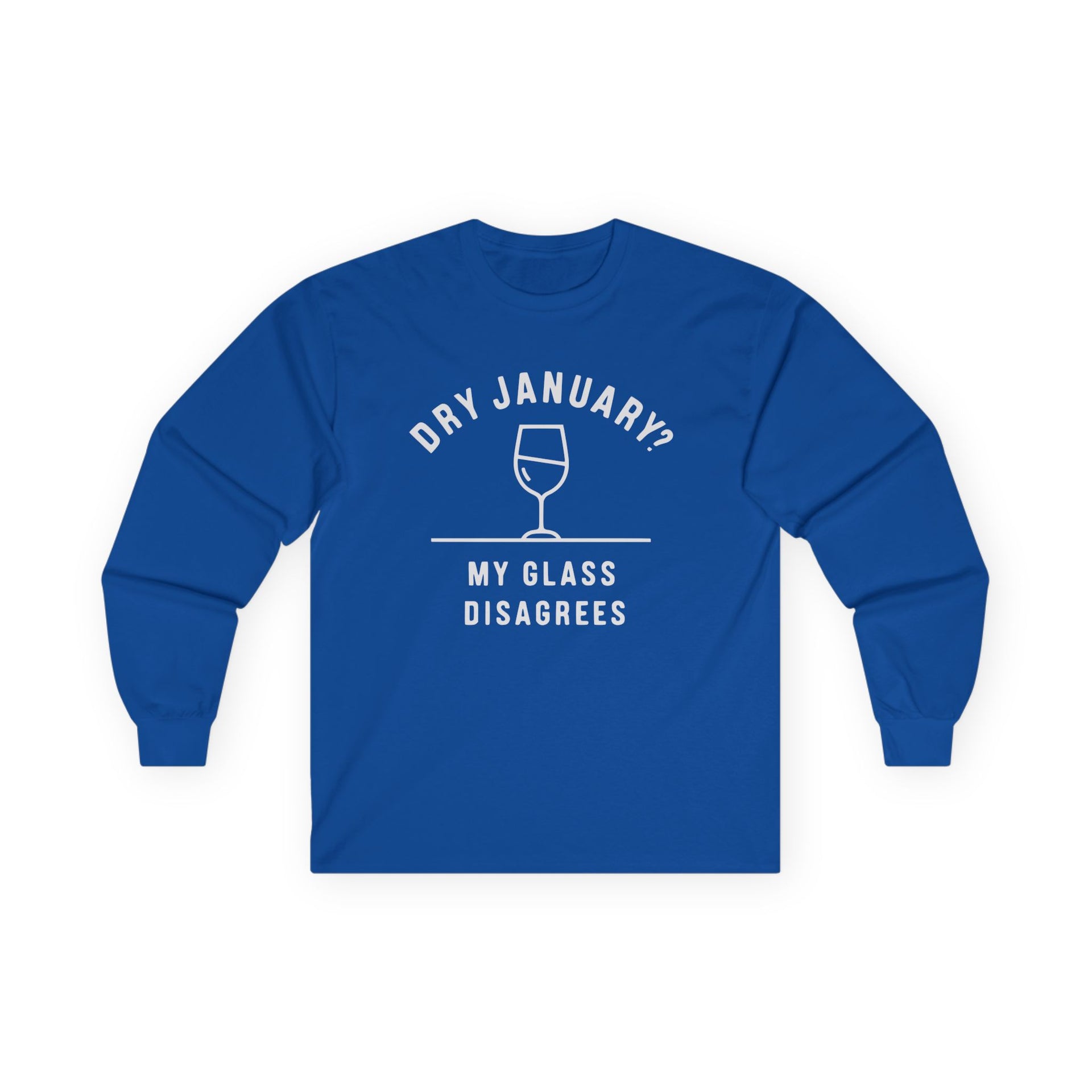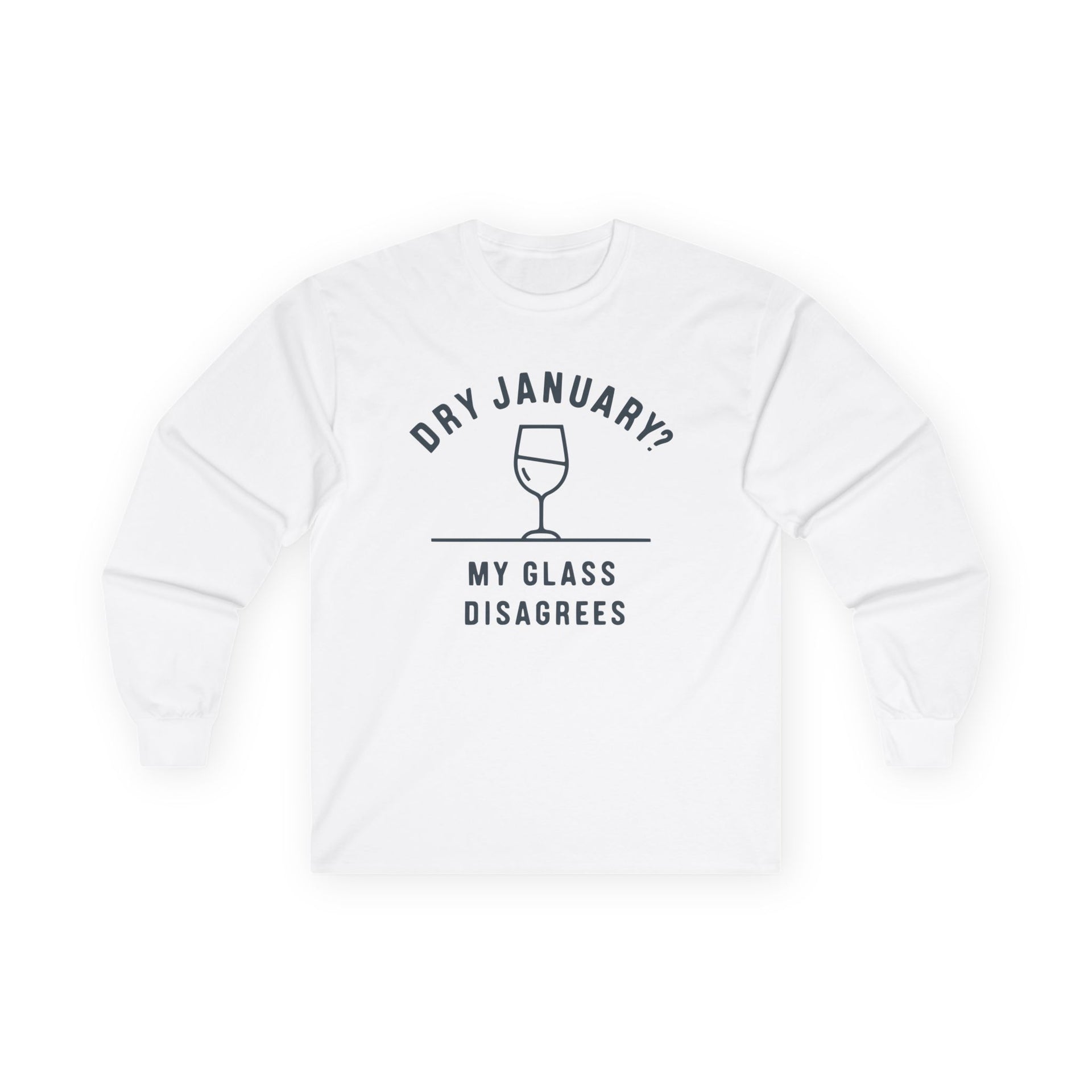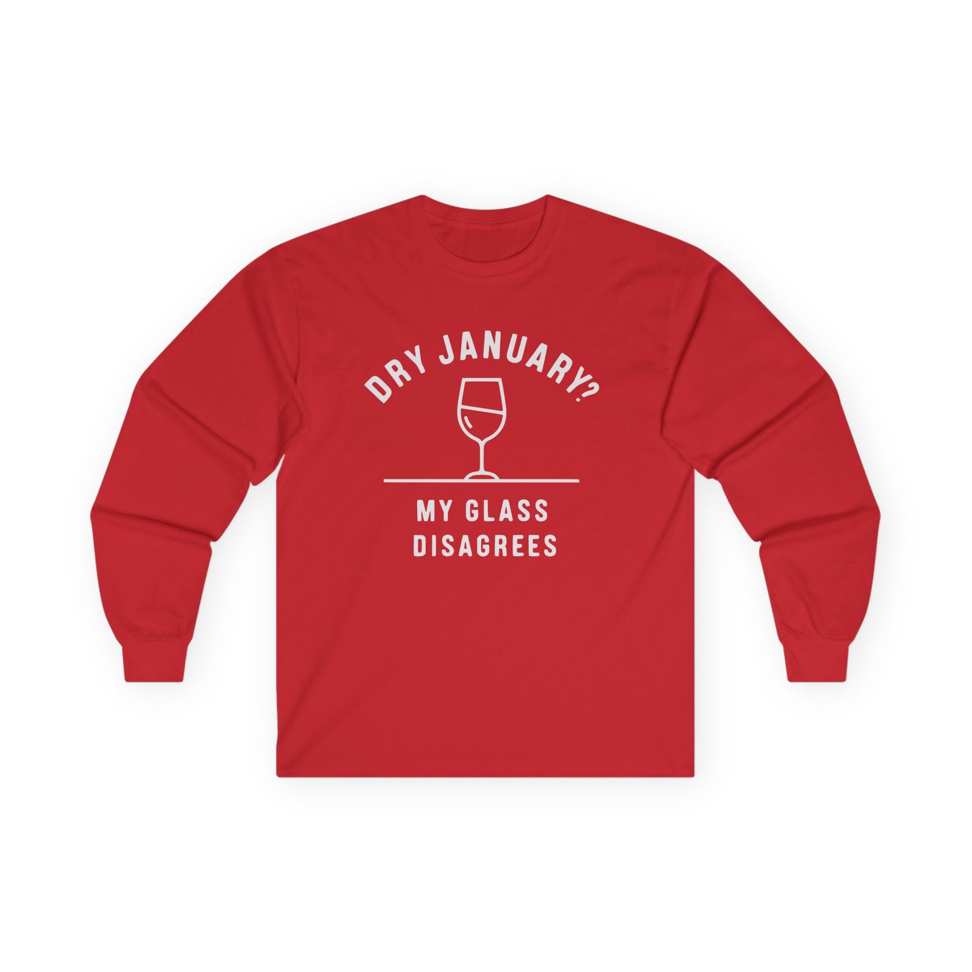 Dry January? My Glass Disagrees Funny Long-Sleeve Shirt - Wine Lover Apparel, Drinking Humor Tee, Sarcastic Gift for Wine Enthusiasts