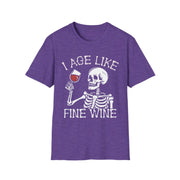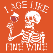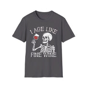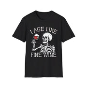 Show off your timeless sense of humor with our "I Age Like Fine Wine" t-shirt featuring a cool skeleton graphic. Perfect for Halloween or any day you want to embrace your vintage vibes, this tee combines a witty phrase with a striking skeleton design that’s sure to turn heads. Whether you're attending a Halloween party, enjoying a casual day out, or just love to make a statement, this shirt is the perfect blend of fun and style. The graphic of the skeleton adds a playful touch to the phrase, making it a must-have for those who appreciate the finer things in life—even as they age.