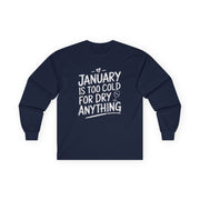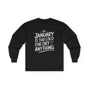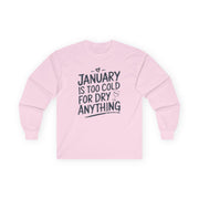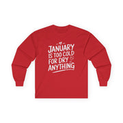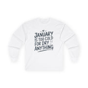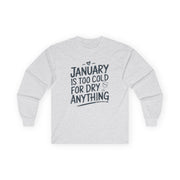 Beat the cold in style with this long-sleeve shirt featuring the phrase: "January Is Too Cold for Dry Anything." Perfect for casual outings, lounging at home, or sharing laughs with friends, this shirt is a must-have for anyone who appreciates a clever take on Dry January.