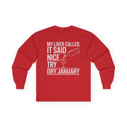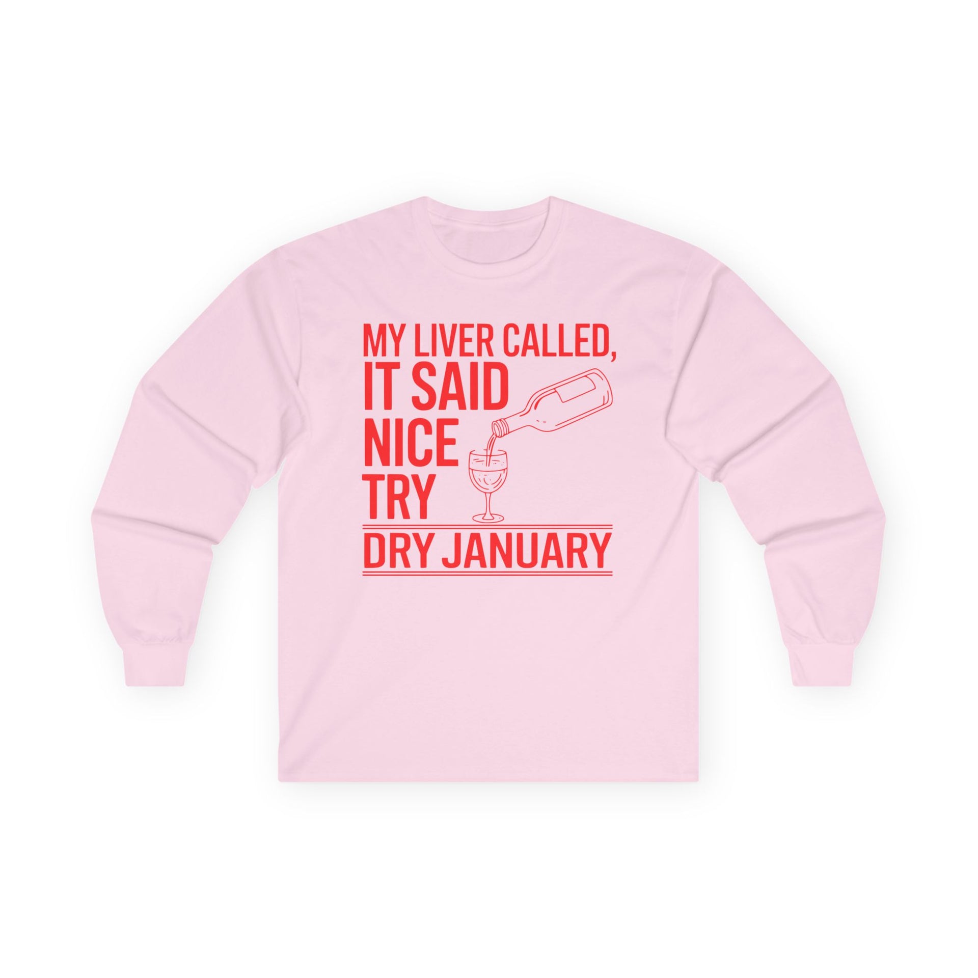 My Liver Called, It Said Nice Try Dry January Long Sleeve Tee| Funny Wine Lover Long SLeeve Tee | Humorous Anti-Dry January Shirt | Sarcastic Drinking Apparel | Unisex Graphic Long Sleeve Tee