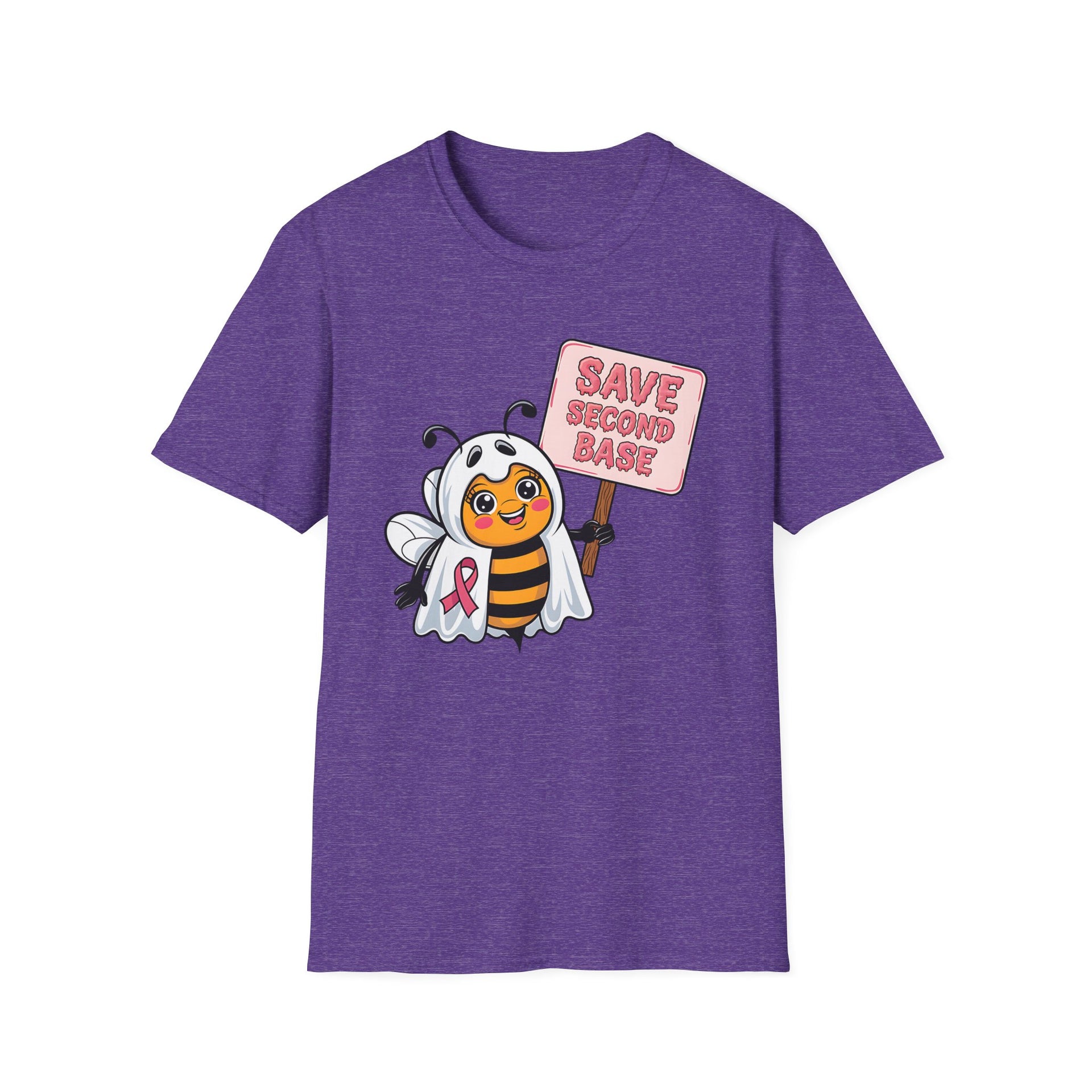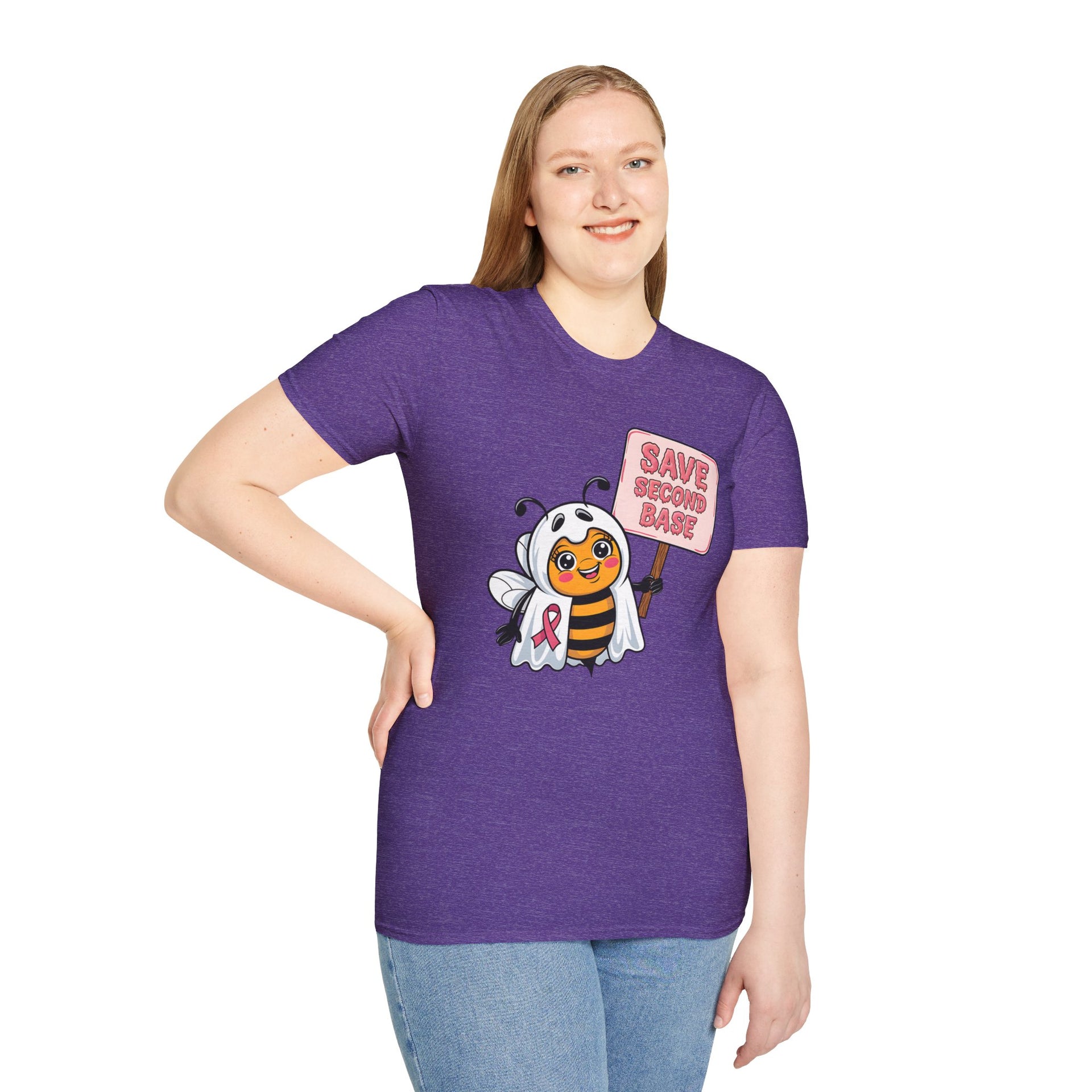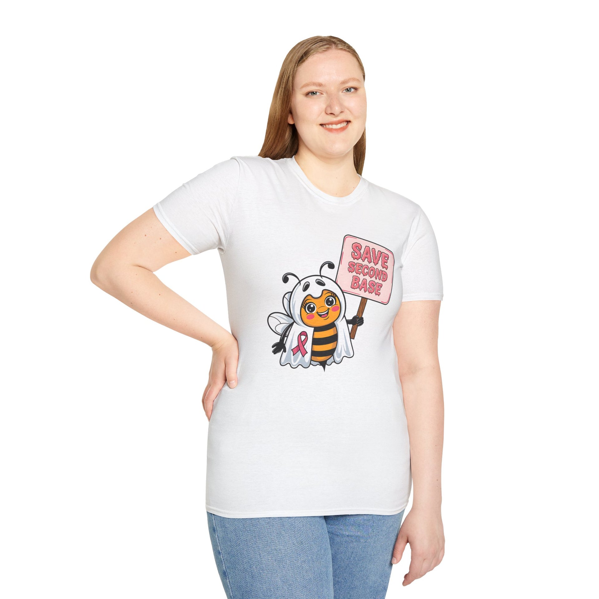 Support Breast Cancer Awareness with a touch of Halloween fun in our Save Second Base t-shirt! Featuring a cute bee dressed in a ghost costume, this playful design raises awareness for breast cancer in a lighthearted, spooky way. Perfect for October’s Spooky Season and Breast Cancer Awareness Month, this soft and comfortable tee is ideal for Halloween parties, awareness events, or just showing your support for the cause. Spread the message and raise awareness with a smile!