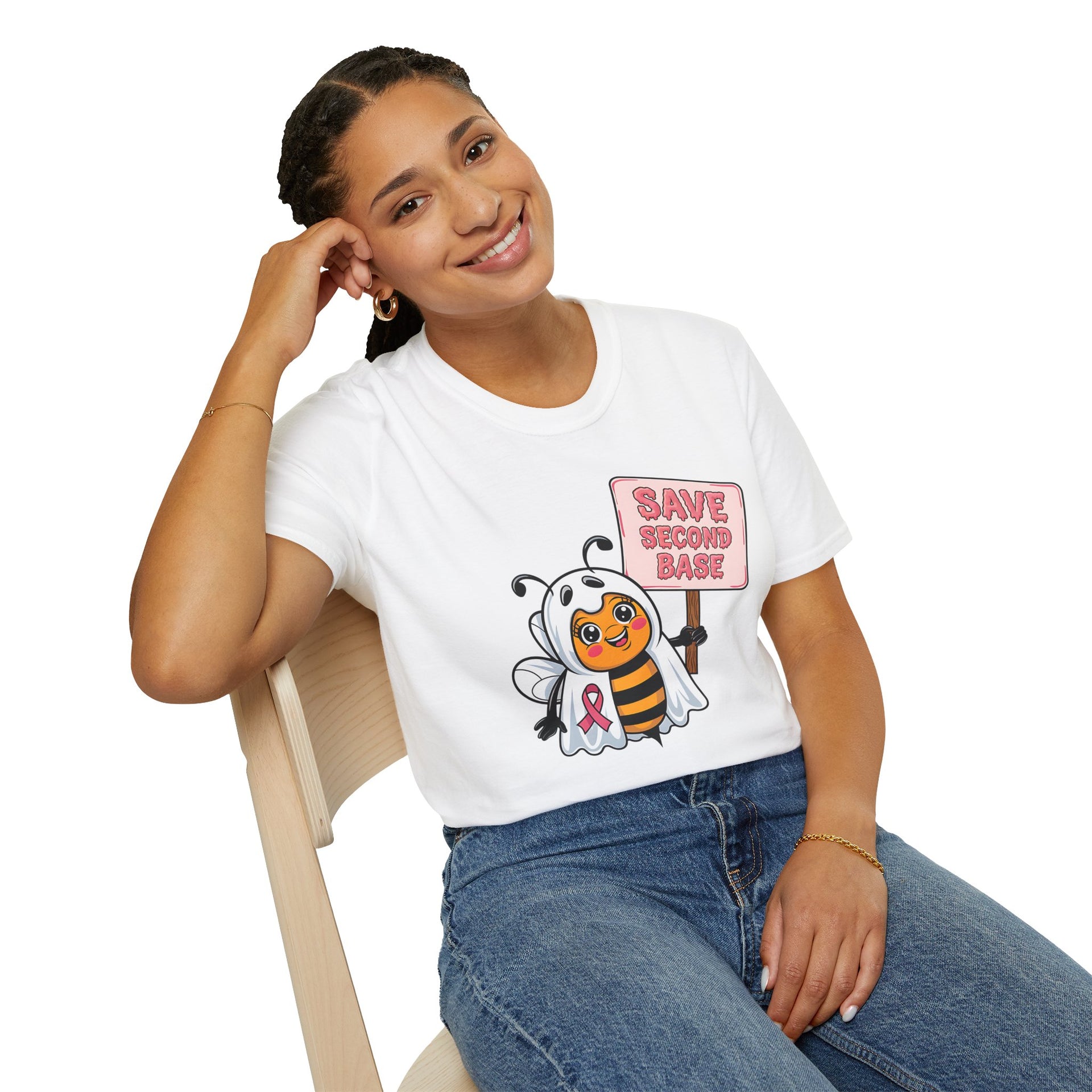- Halloween & Awareness Design: Features the empowering phrase "Save Second Base" with a bee dressed as a ghost, blending humor with a strong message of breast cancer awareness.