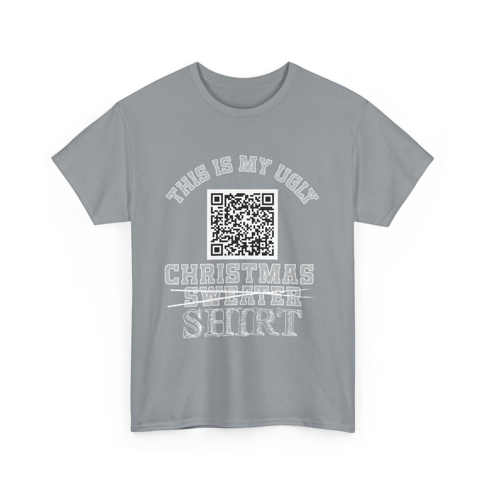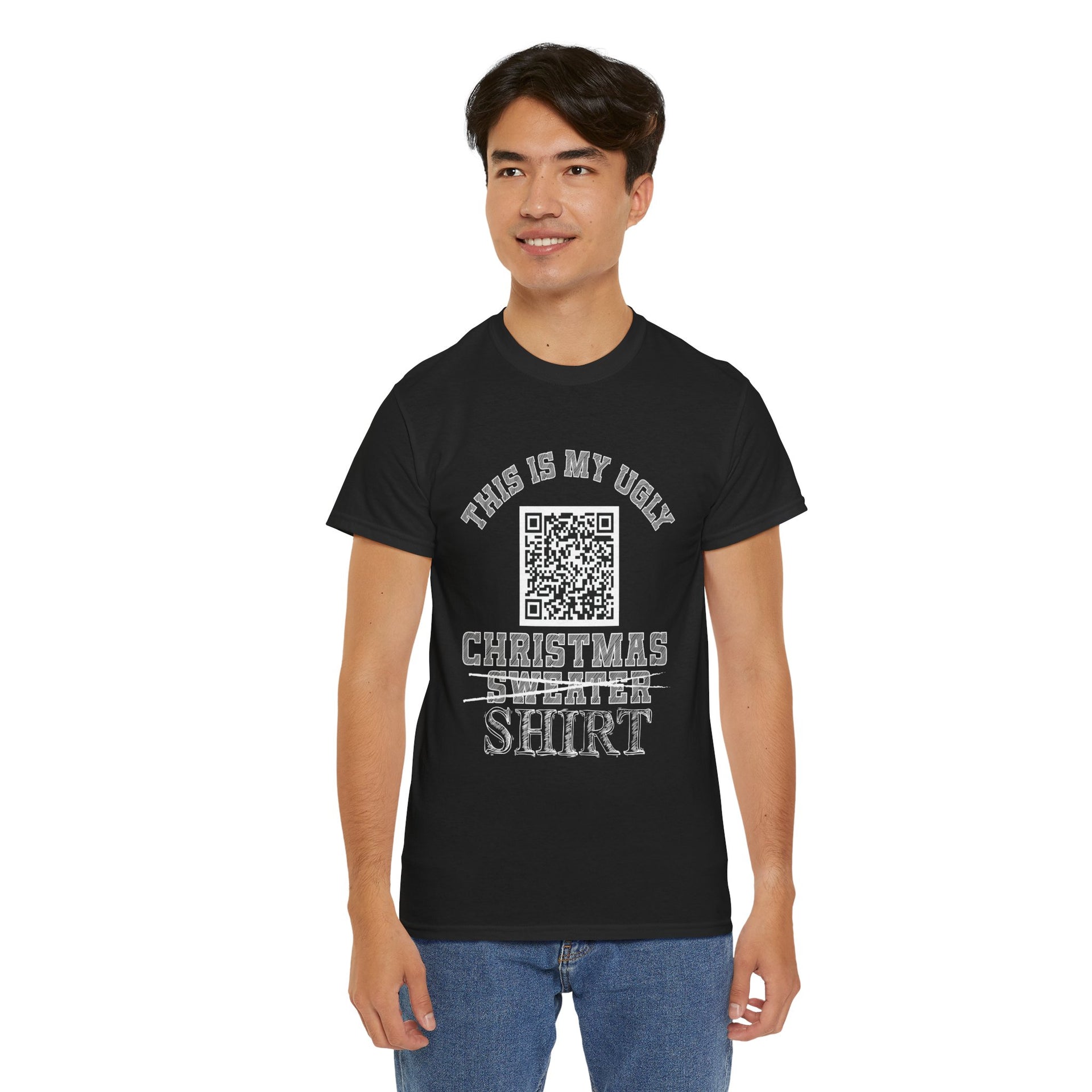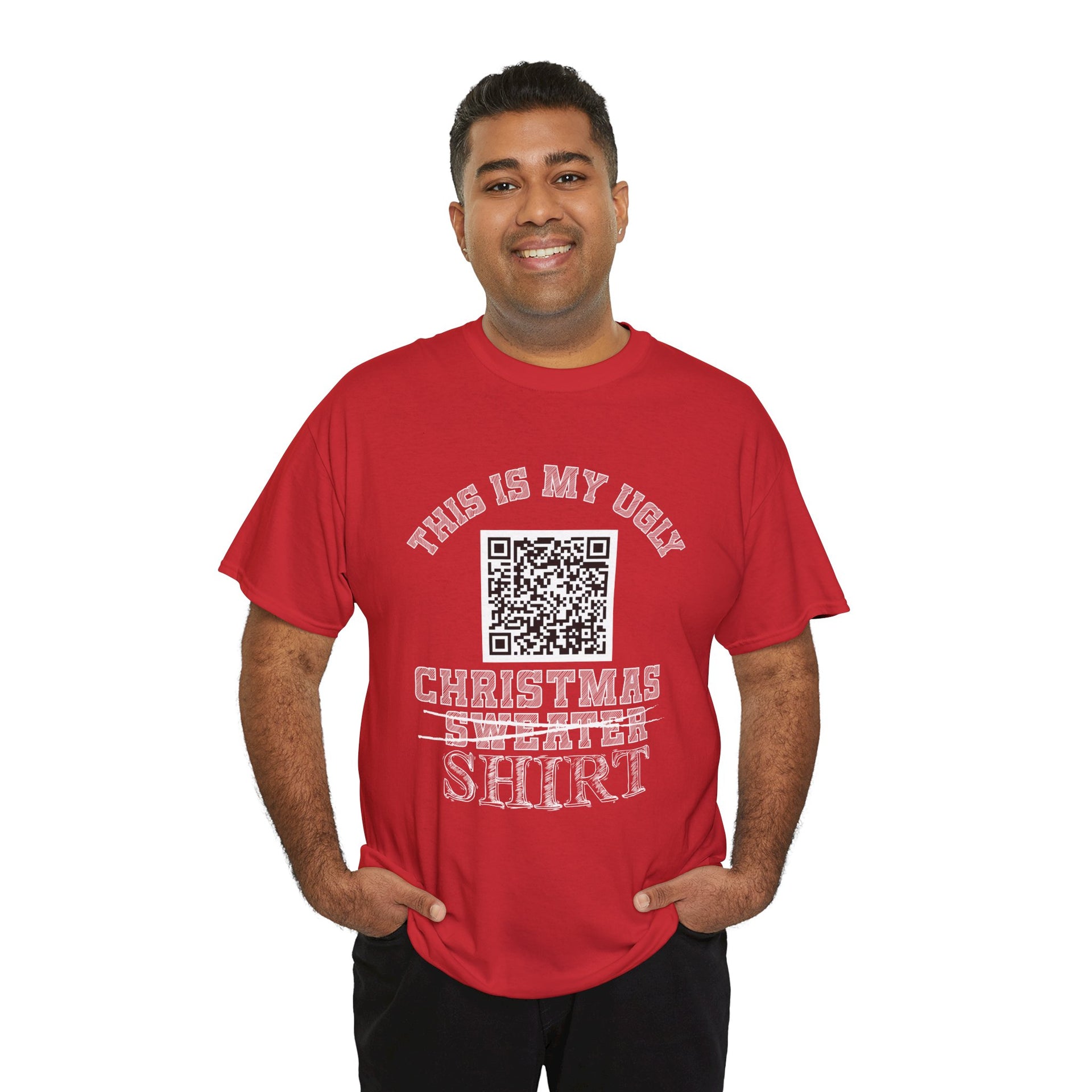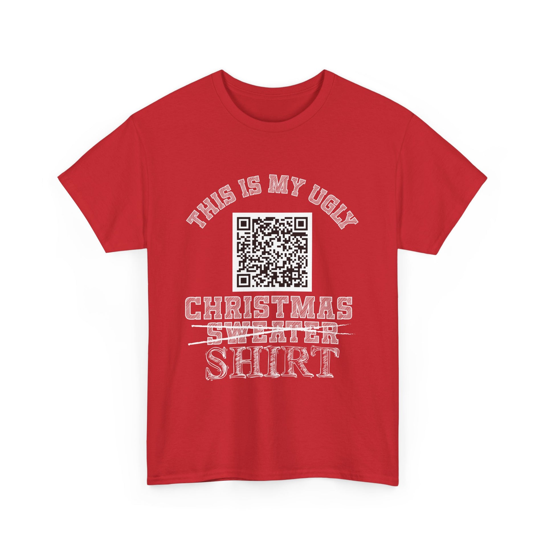 Make a statement this holiday season with a unique twist on the classic ugly Christmas sweater! Our "This Is My Ugly Christmas Sweater" t-shirt, with "Sweater" crossed out and "Shirt" written underneath, combines humor and tech with a QR code that opens a special message. Perfect for parties and gift exchanges!