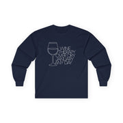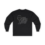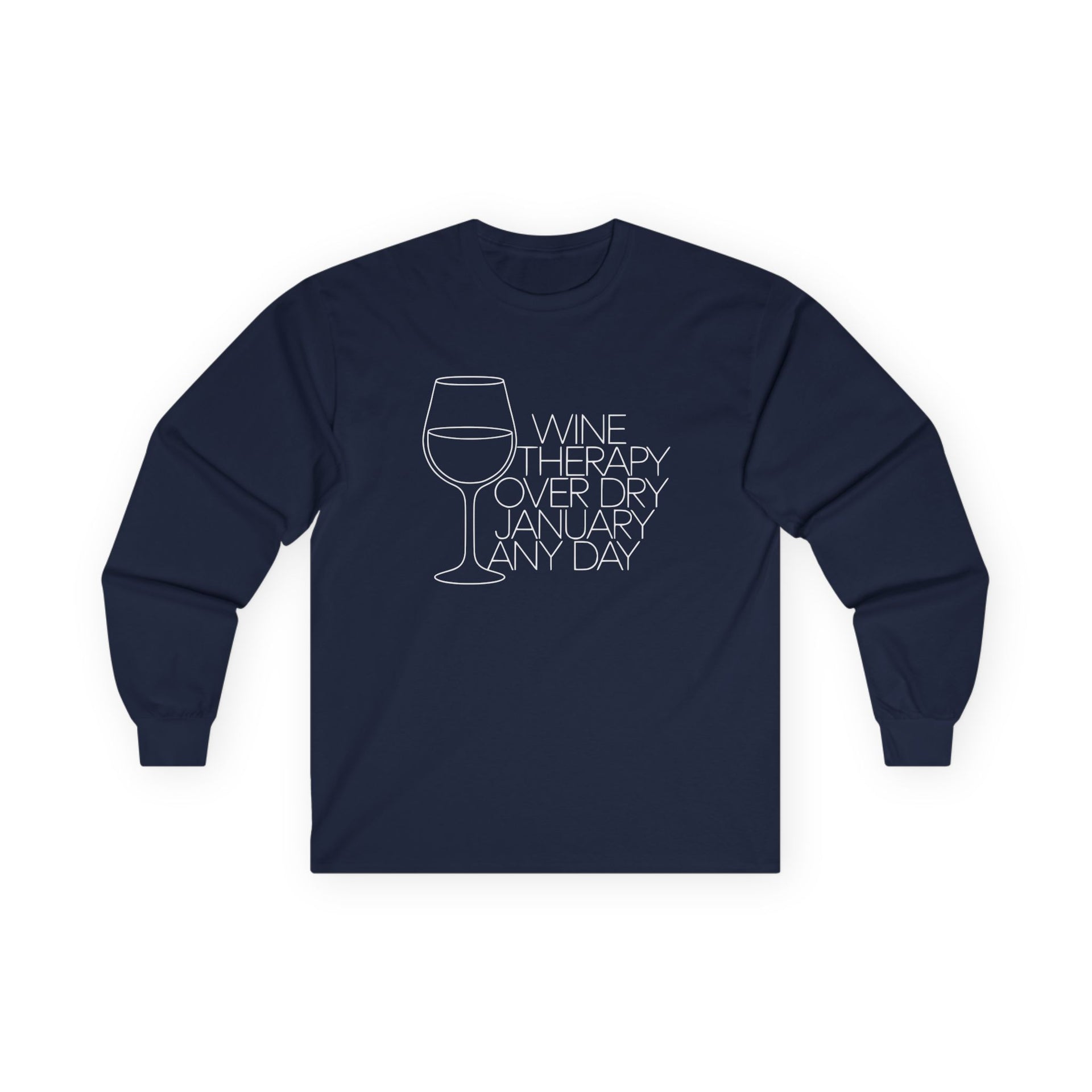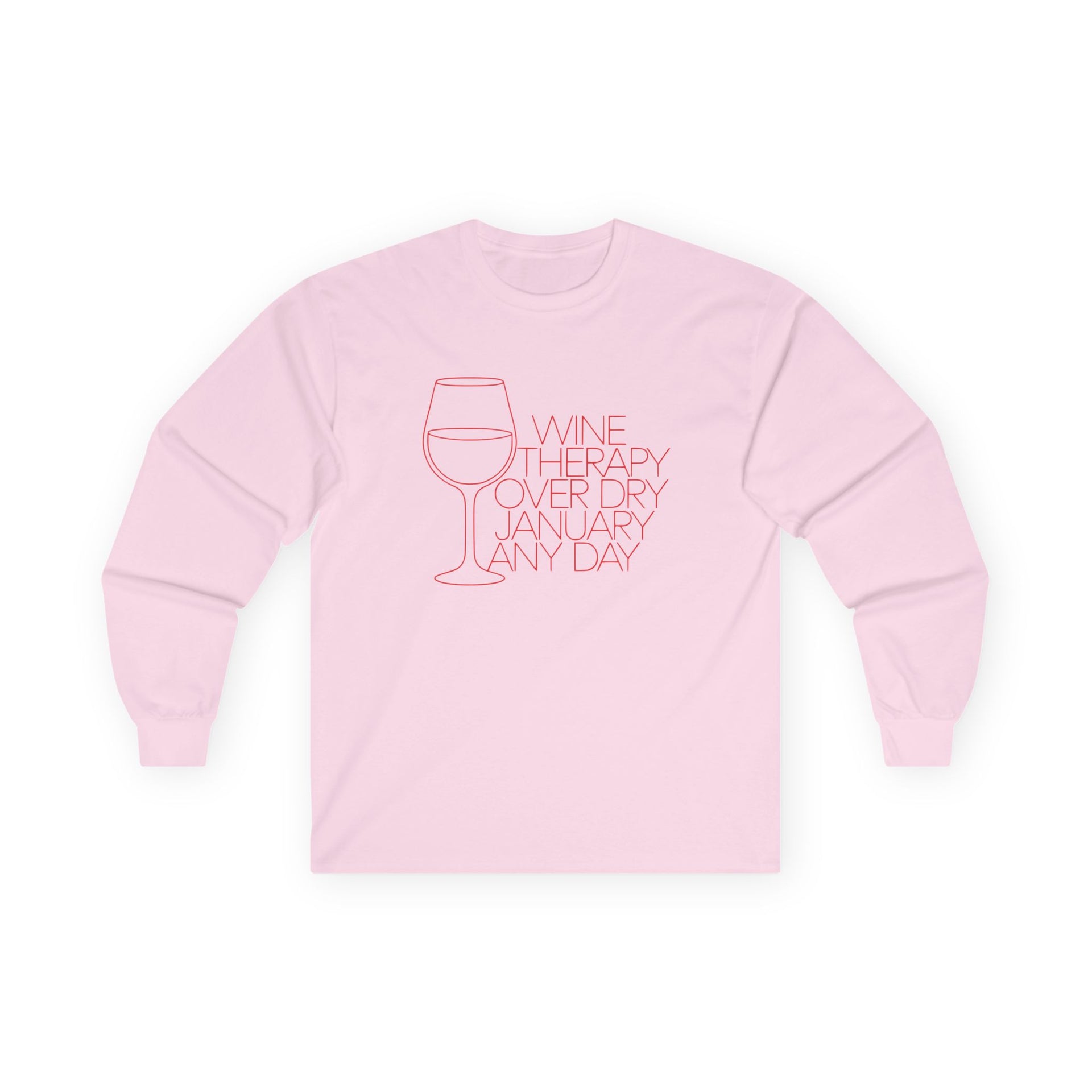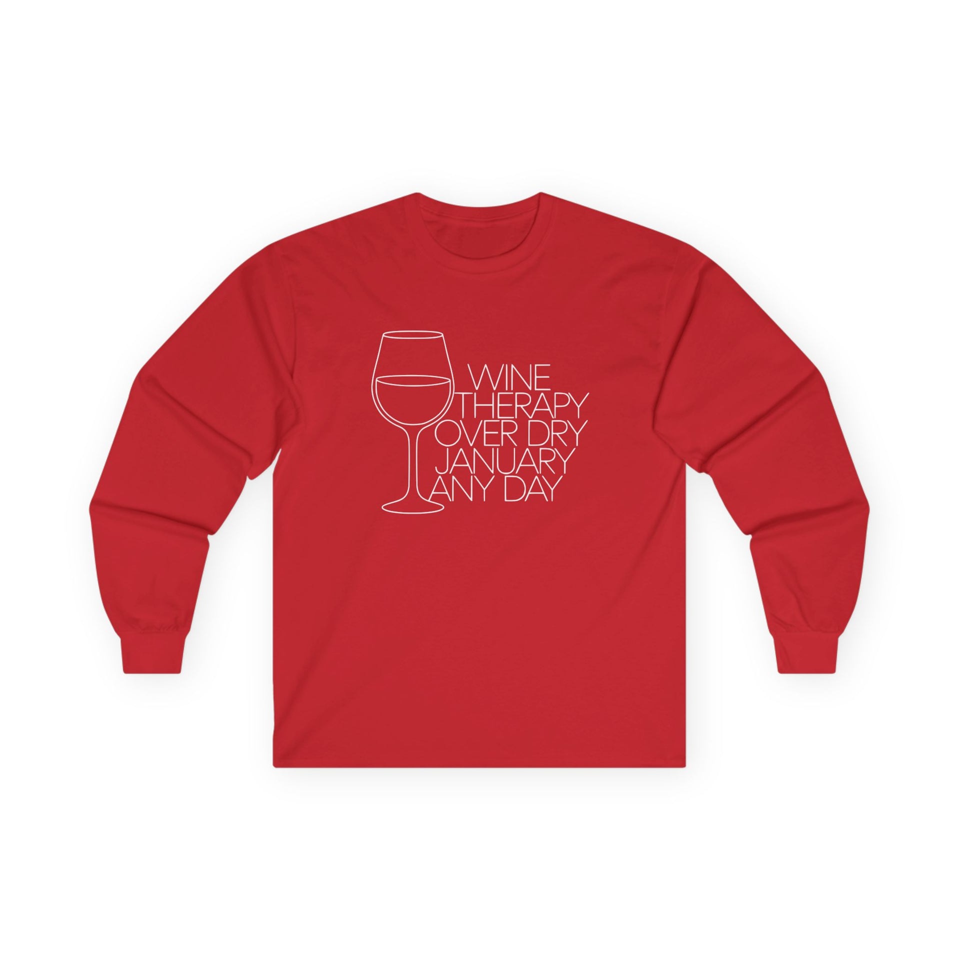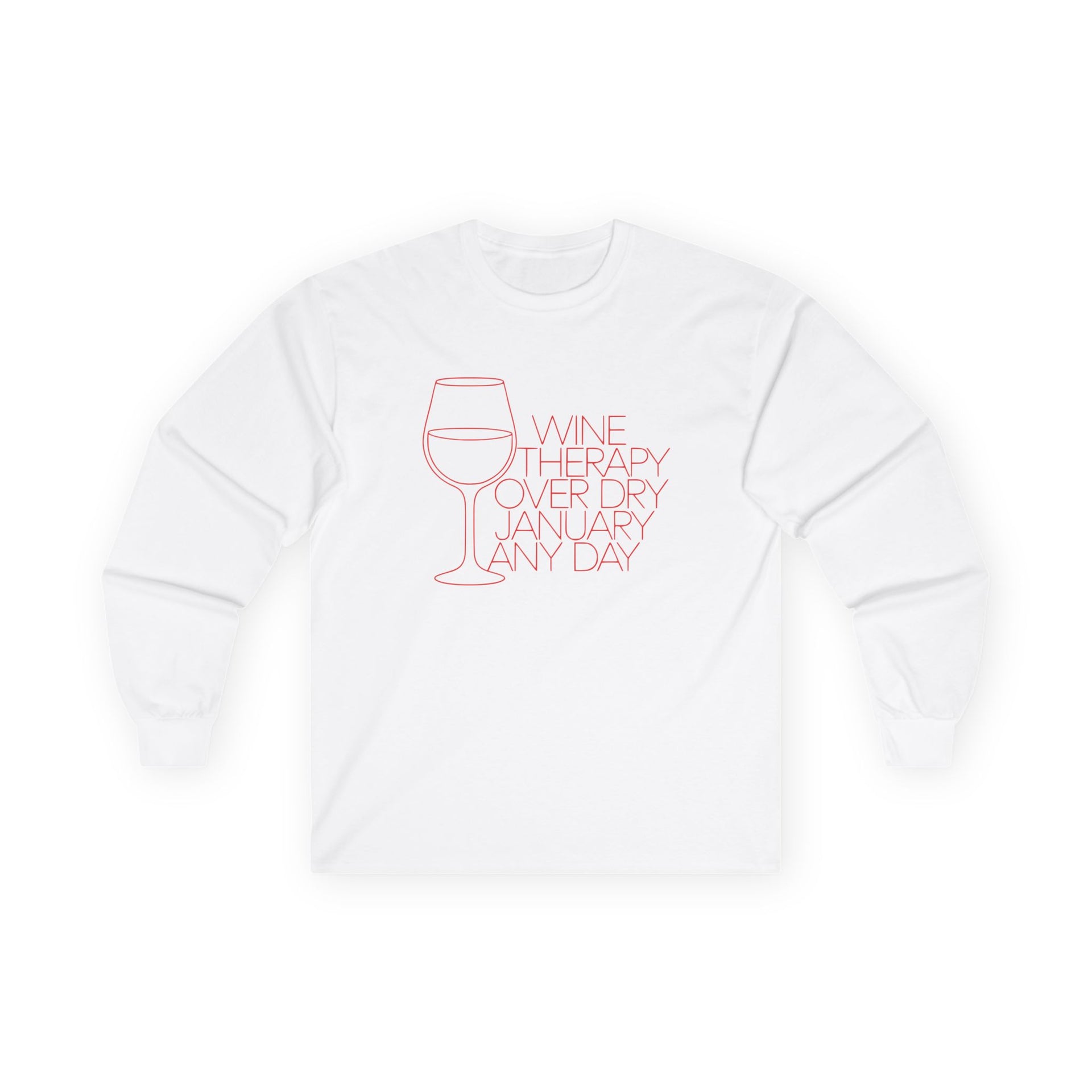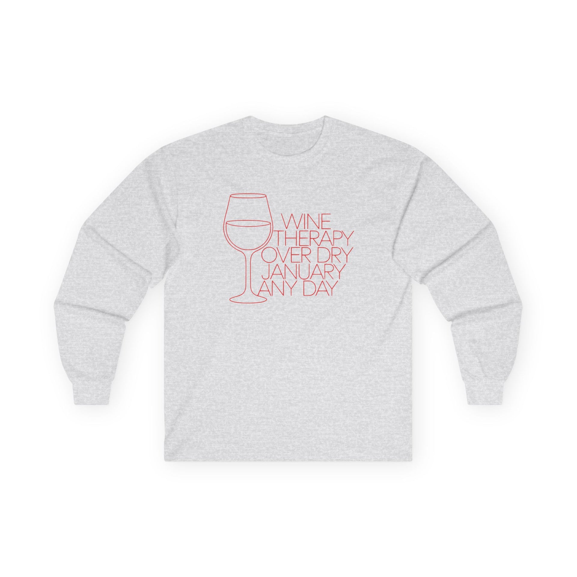 Wine Therapy Over Dry January Any Day Long Sleeve Tee | Funny Wine Lover Tee | Humorous Anti-Dry January Shirt | Sarcastic Drinking Apparel | Unisex Graphic Longe Sleeve Tee