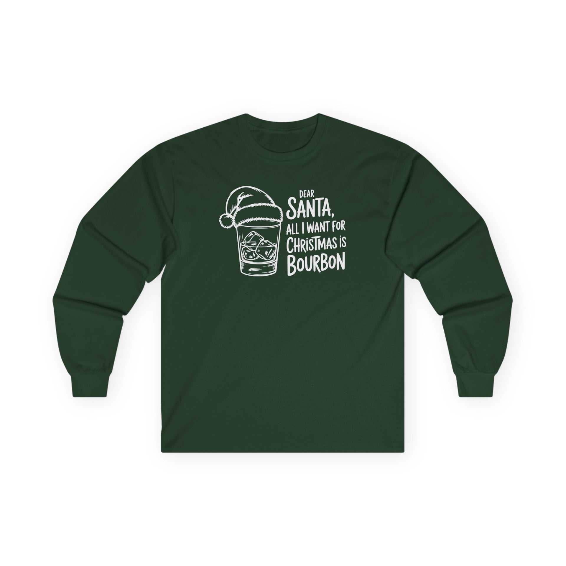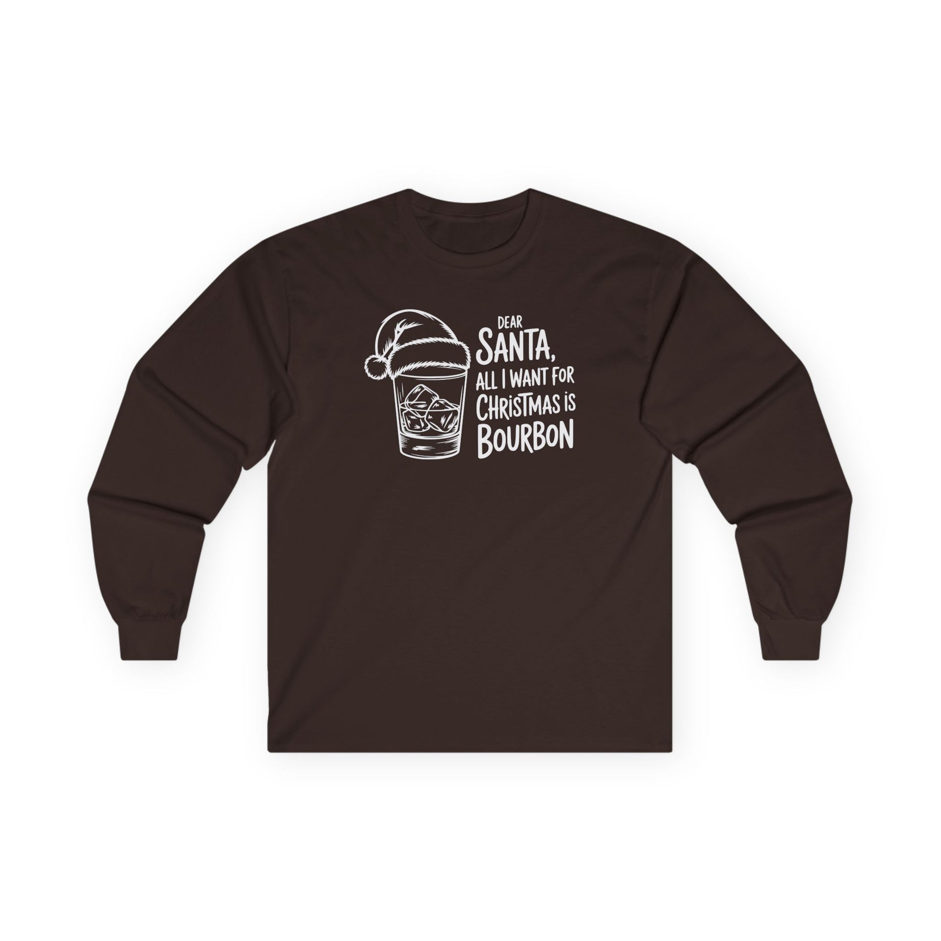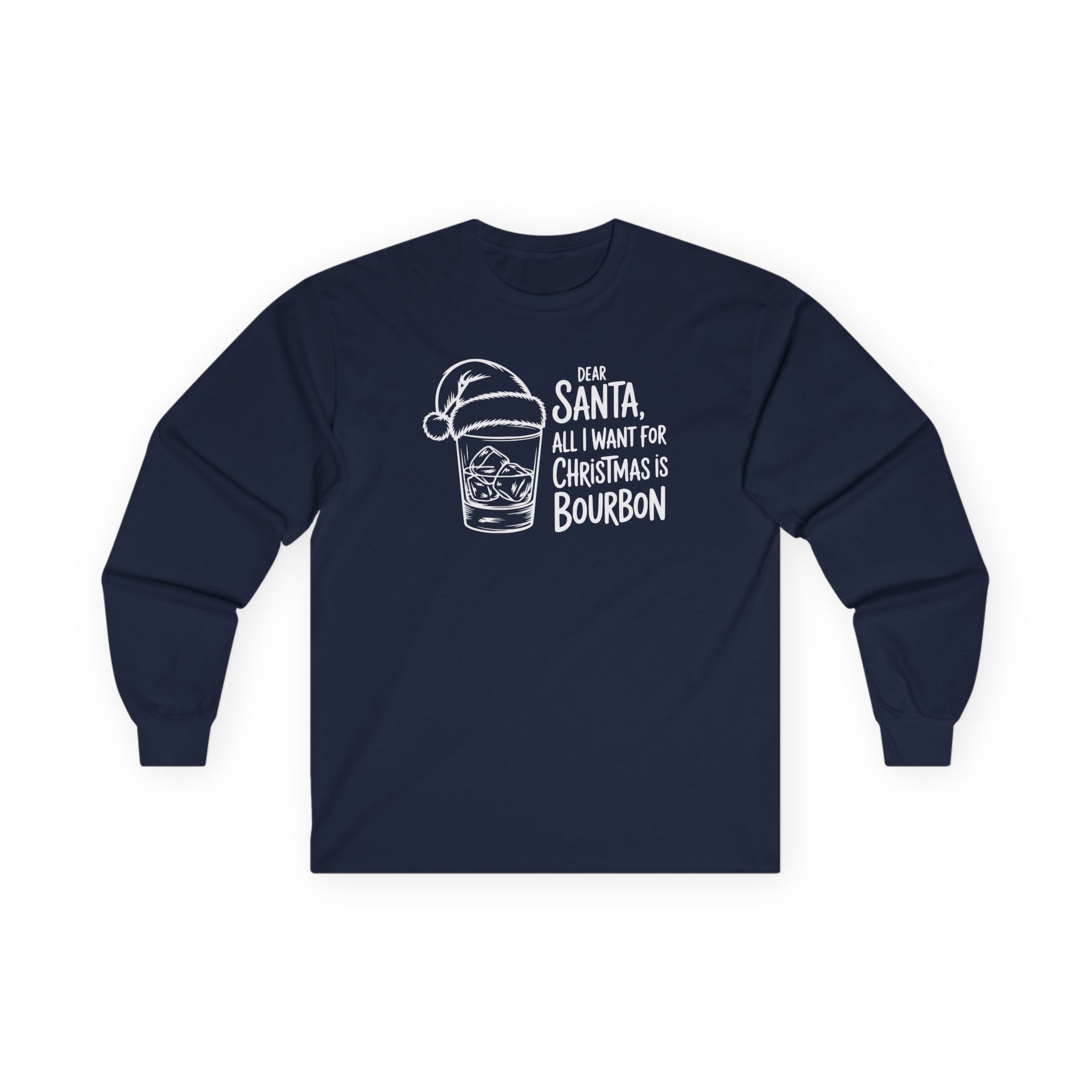 If your Christmas wish list starts and ends with bourbon, this “Dear Santa, All I Want for Christmas Is Bourbon” long sleeve tee says it all. Featuring a festive rocks glass topped with Santa’s hat, this design delivers clean, modern holiday humor for anyone who prefers their Christmas spirit served over ice.