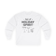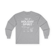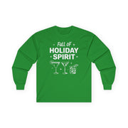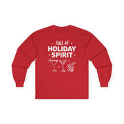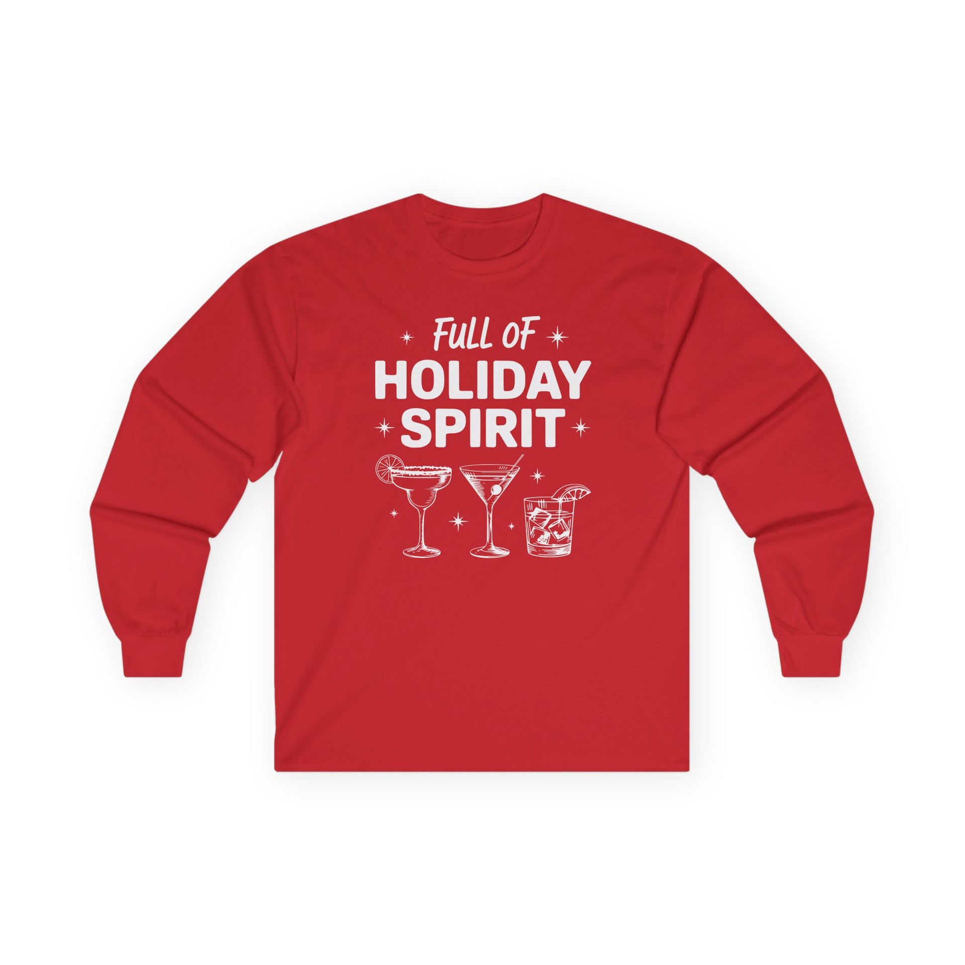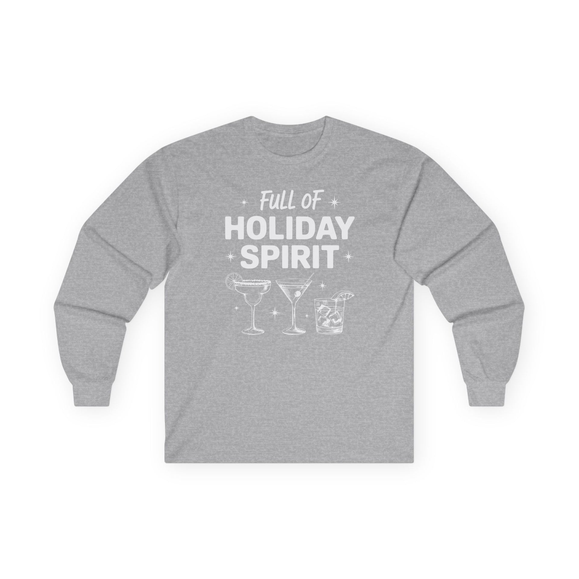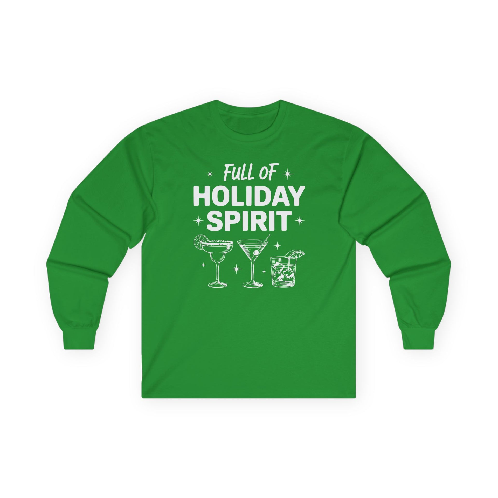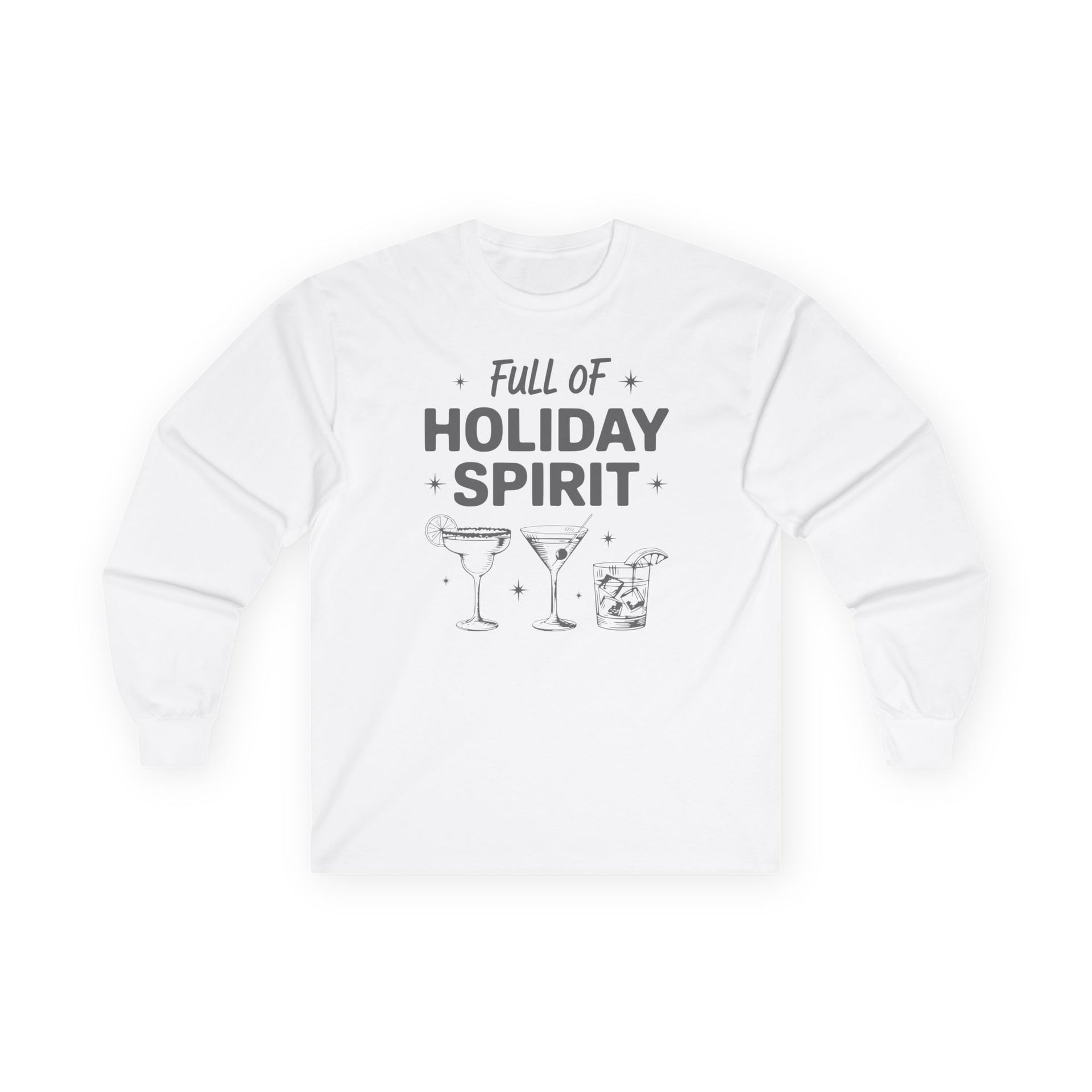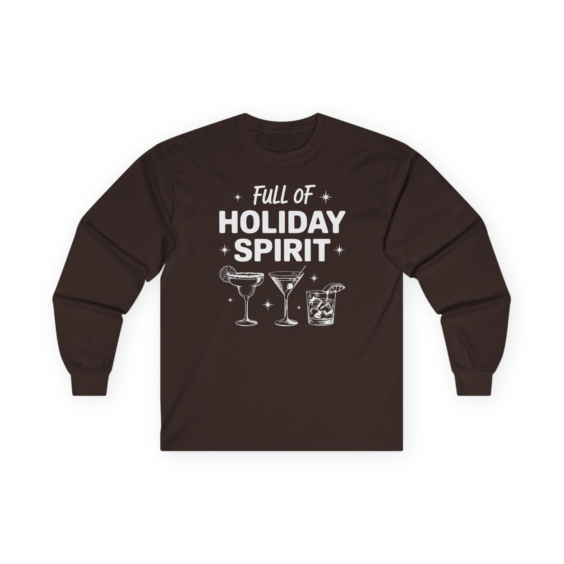 Bring cheerful holiday vibes to every celebration with this playful “Full of Holiday Spirit” long sleeve tee. Featuring a trio of festive cocktail glasses dressed in lights, ornaments, and seasonal décor, this design is perfect for anyone who loves mixing merriment with a good drink.