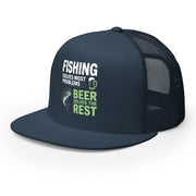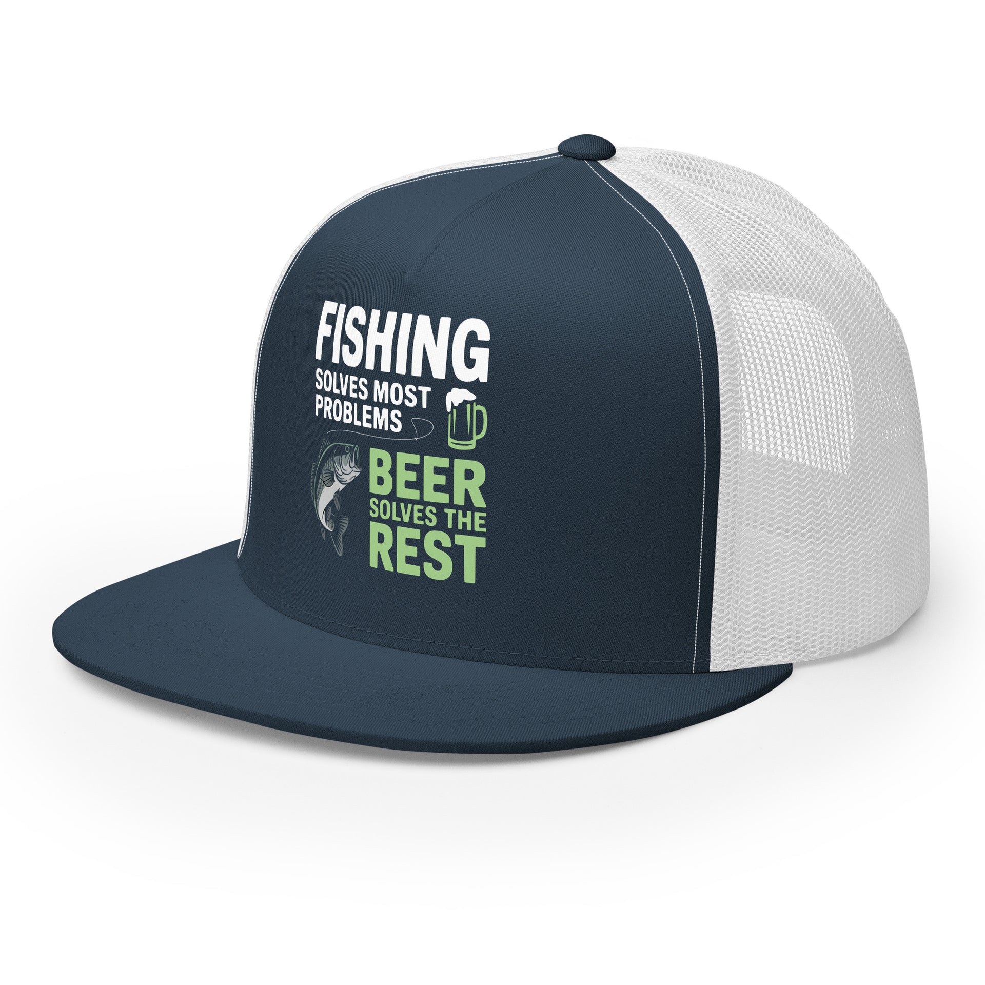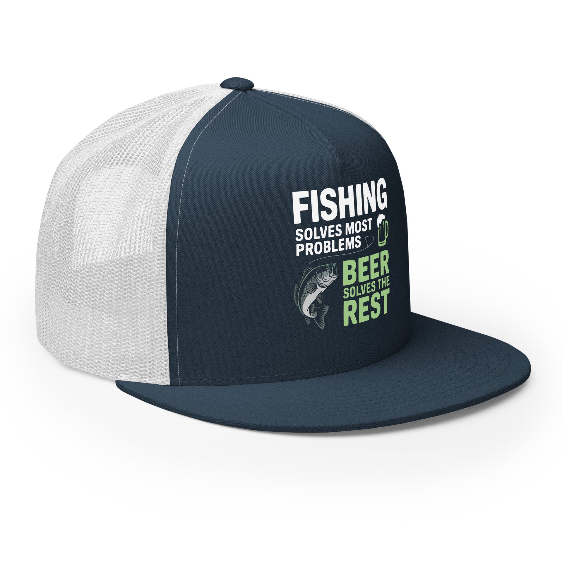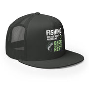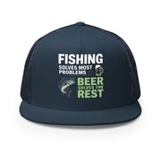 Flat Bill Fishing Hat – Fishing Solves Most Problems Beer Solves the Rest – Funny Trucker Hat for Men – Lake Life Hat – Father's Day Fishing Gift