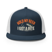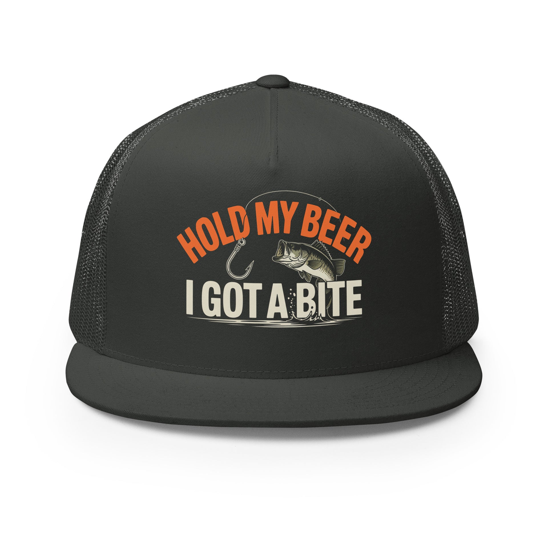Flat Bill Fishing Hat – Hold My Beer I Got a Bite – Funny Trucker Hat for Men – Lake Life Hat – Fishing Gift for Dad – Outdoor Adventure Hat