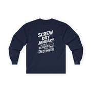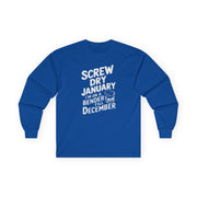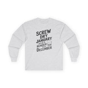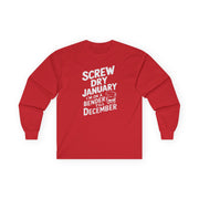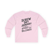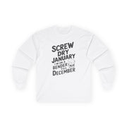 Screw Dry January, I’m on a Bender Till December Funny Long-Sleeve Shirt - Drinking Humor Tee, Wine and Beer Lover Apparel, Gift for Beverage Enthusiasts