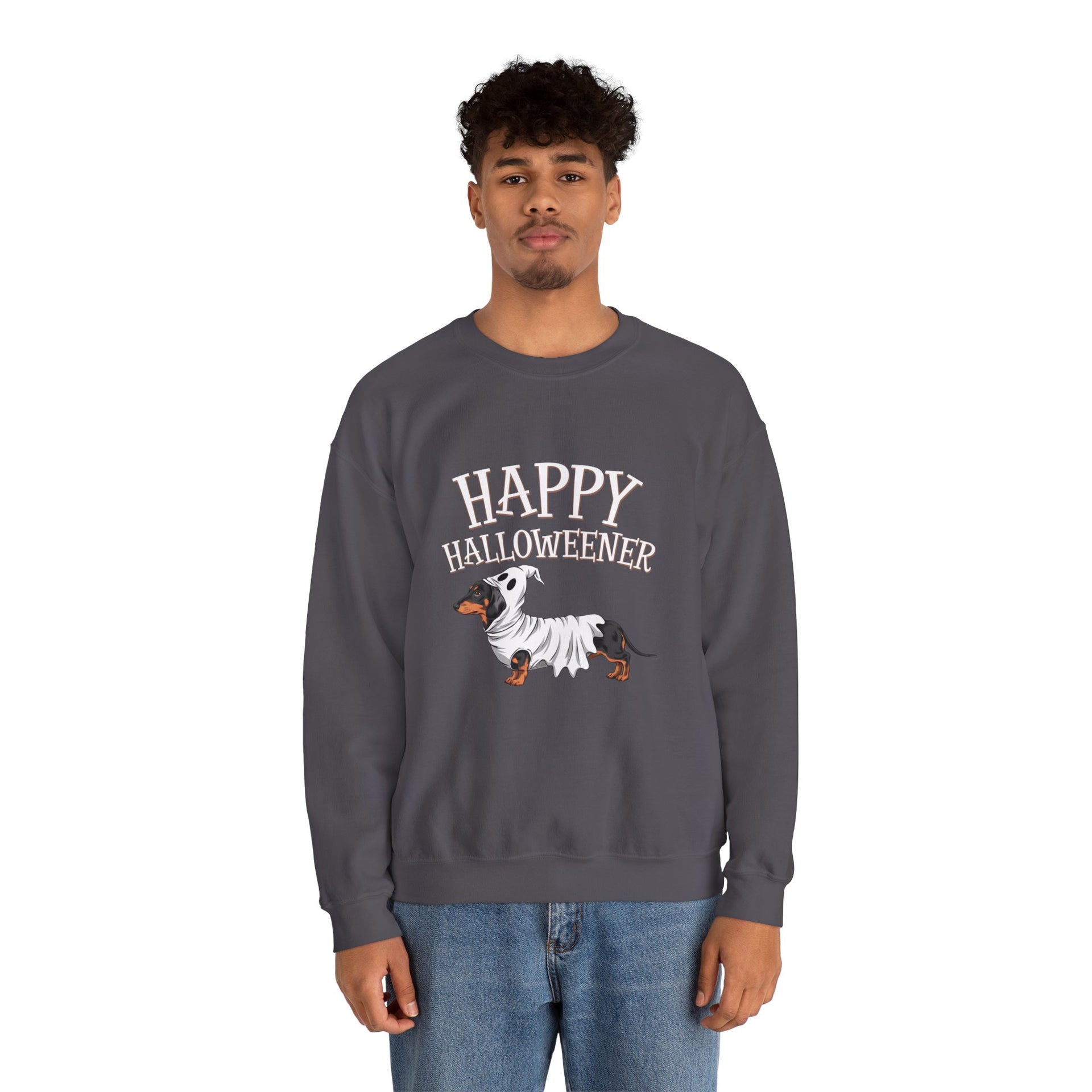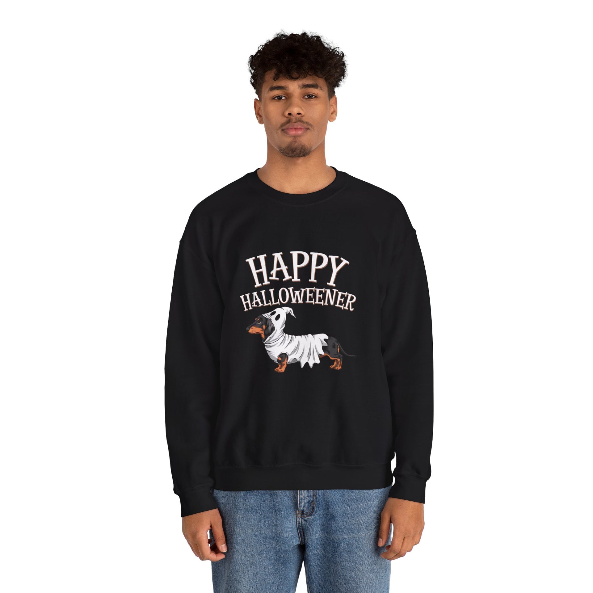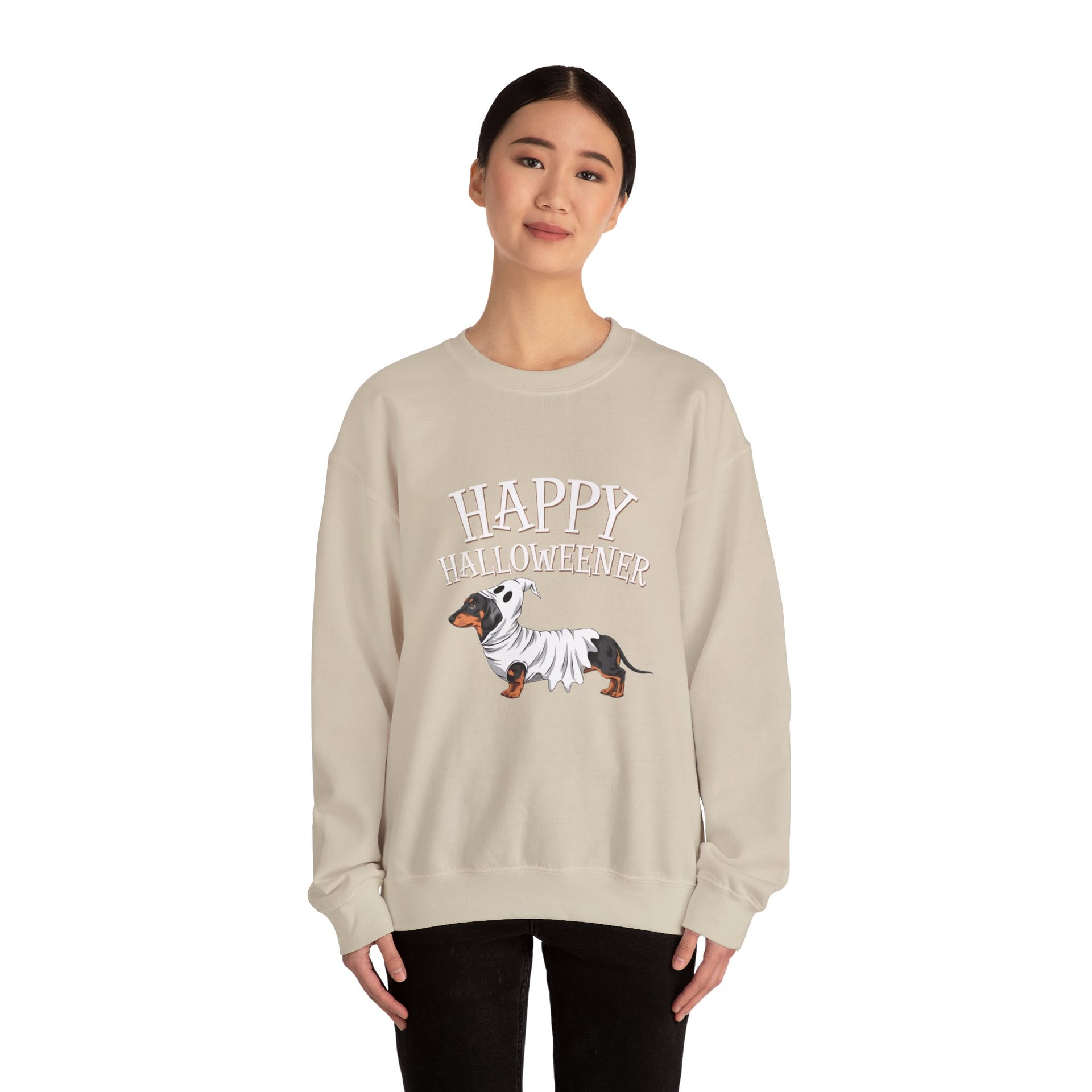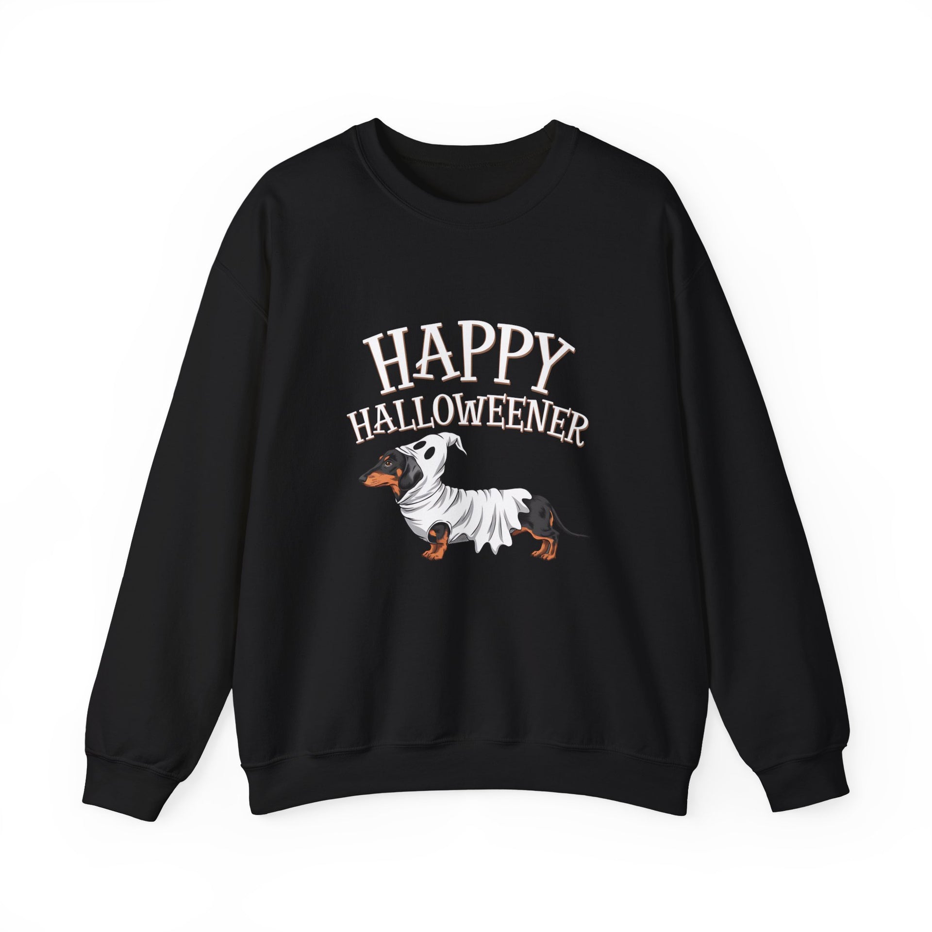 Happy Halloweener Sweatshirt – Funny Dachshund in Ghost Costume for Spooky Season