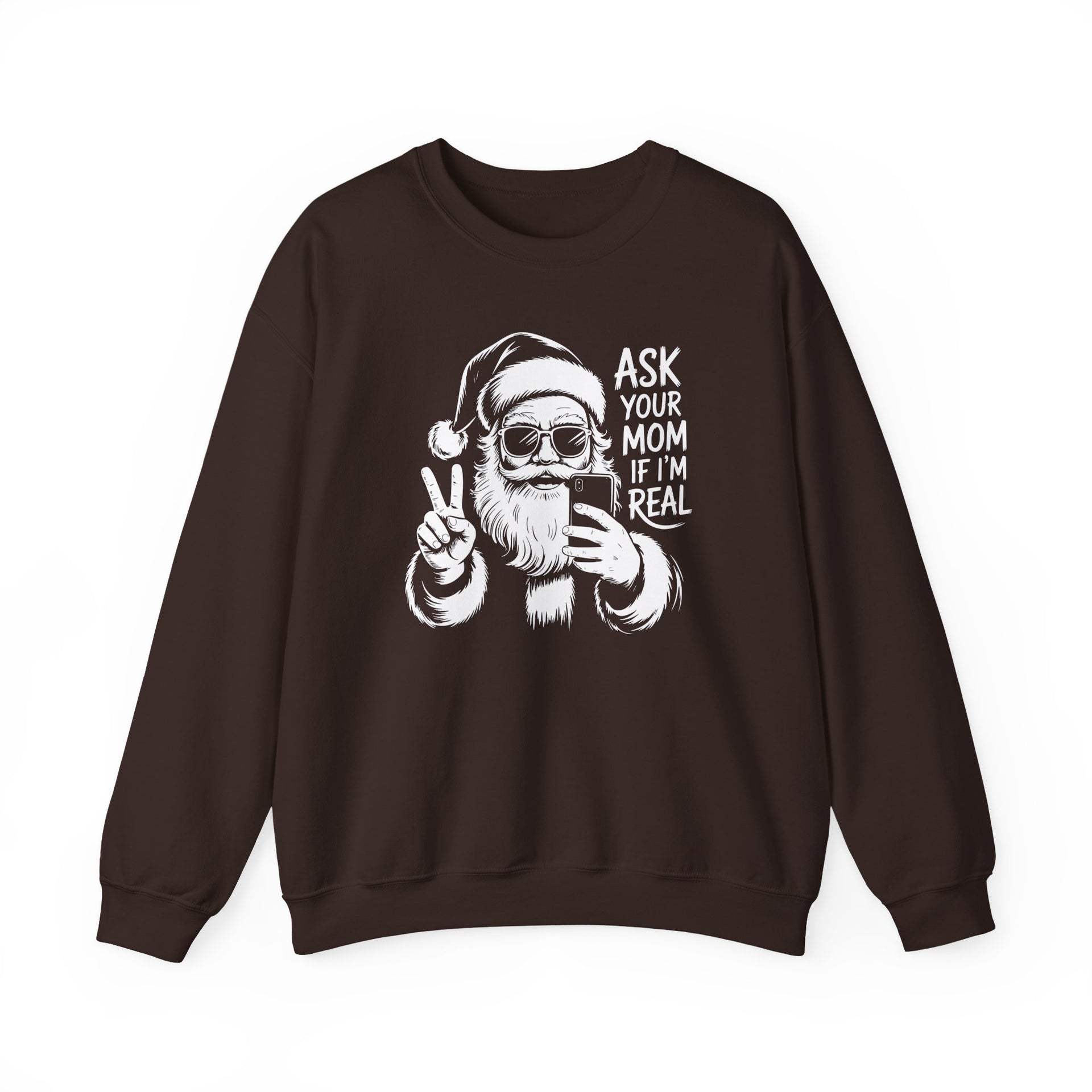 Make the season extra fun with this “Ask Your Mom If I’m Real” Christmas sweatshirt featuring Santa snapping a selfie with sunglasses and a peace sign. It’s bold, playful, and perfect for anyone who brings attitude and laughs to the holidays.