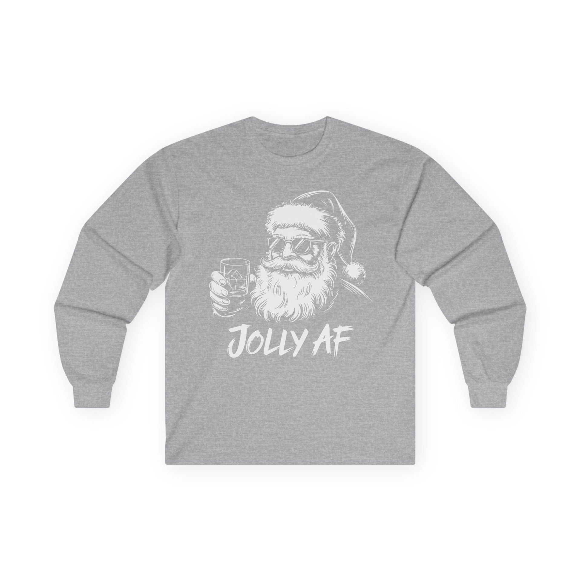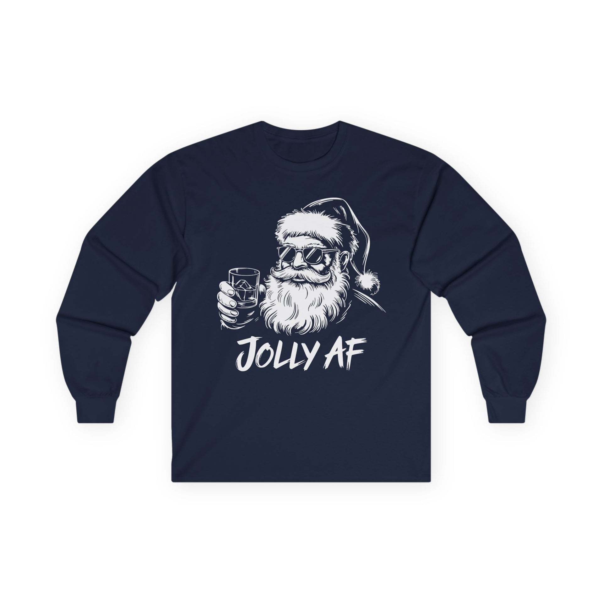 Jolly AF Long Sleeve Tee — Funny Santa Drinking Whiskey Christmas Shirt