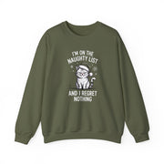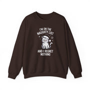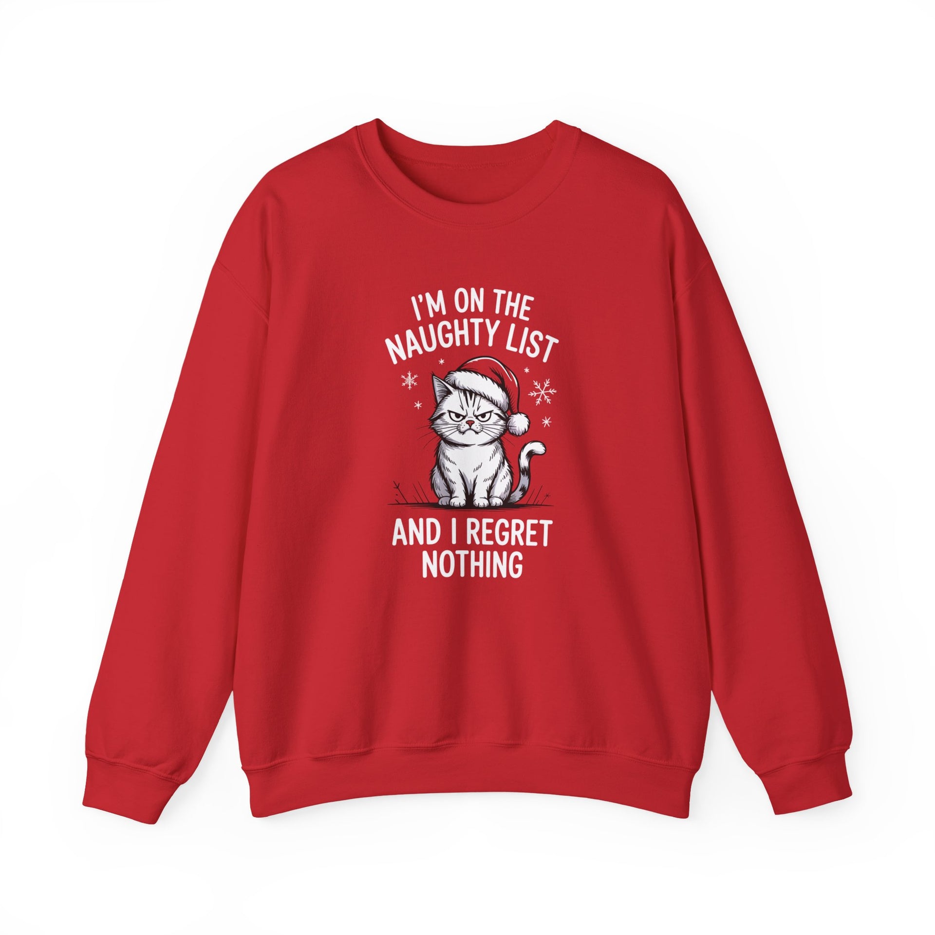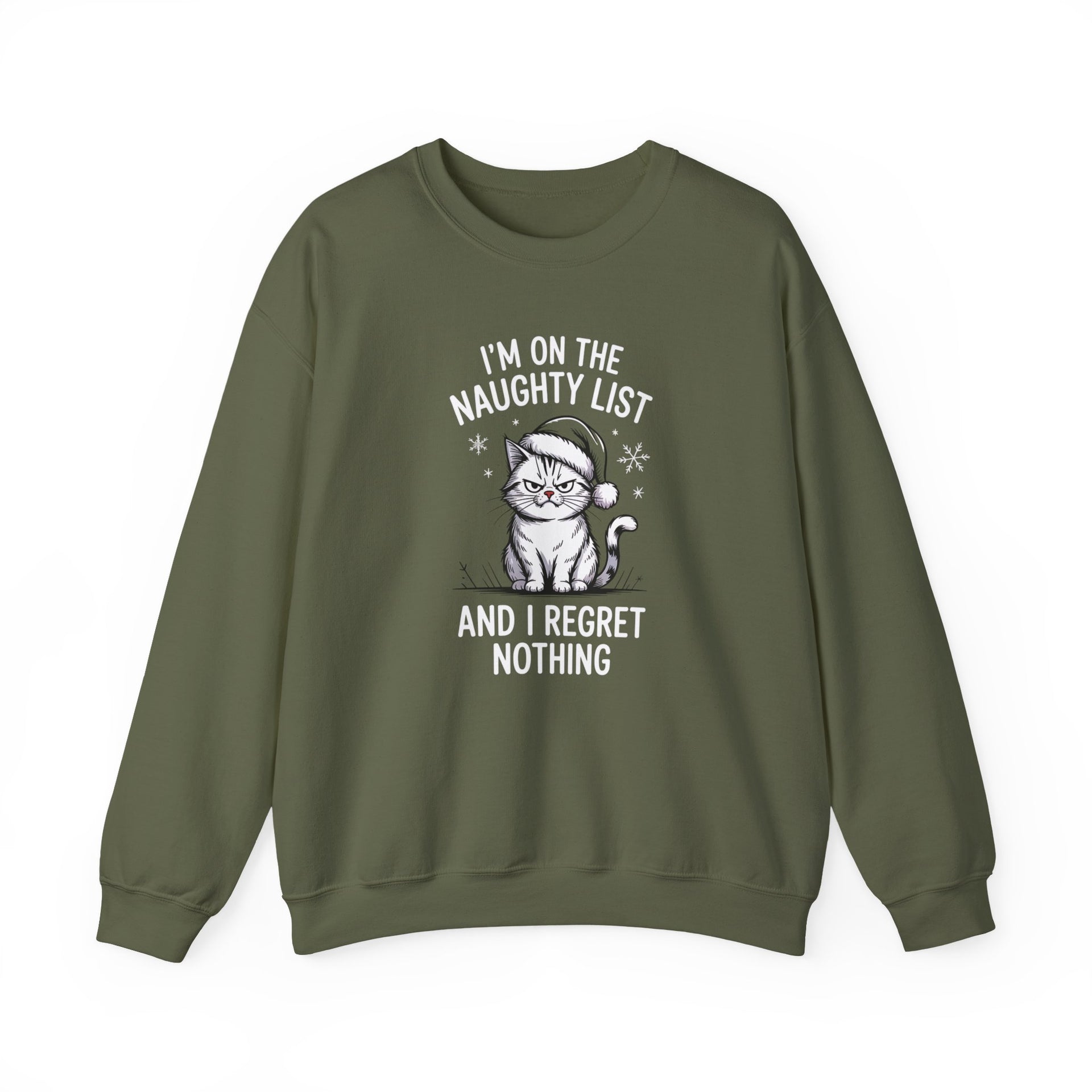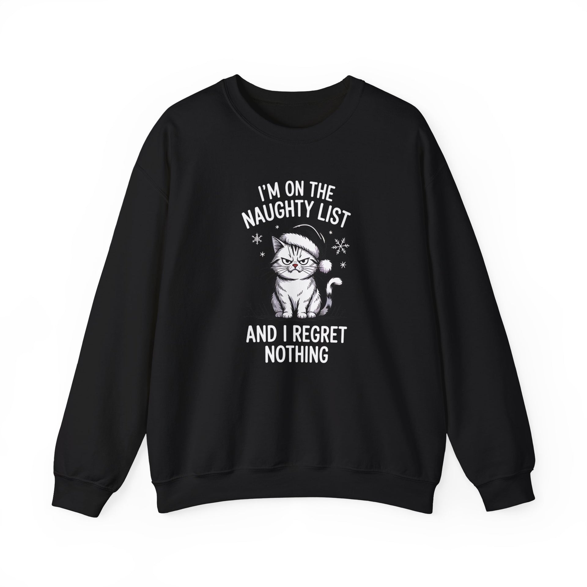 Own your holiday attitude with this “I’m on the Naughty List and I Regret Nothing” grumpy cat Christmas sweatshirt. Featuring a hilariously unimpressed cat wearing a Santa hat, this design captures the mood of every cat (and human) who simply refuses to pretend they’ve been “nice” this year.