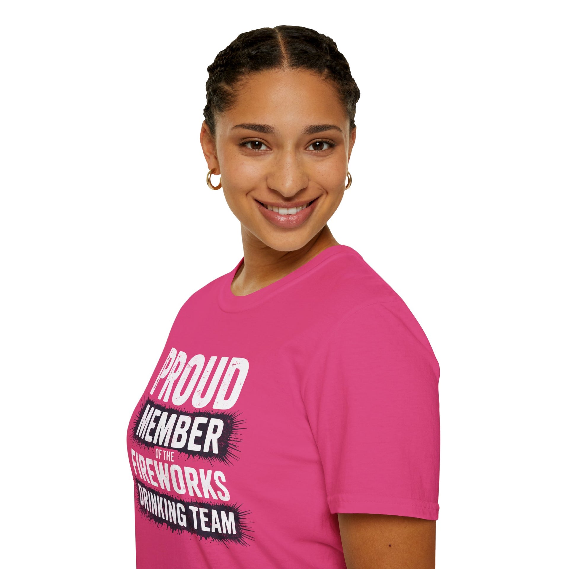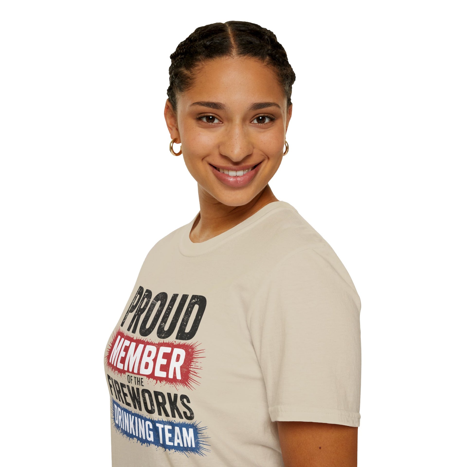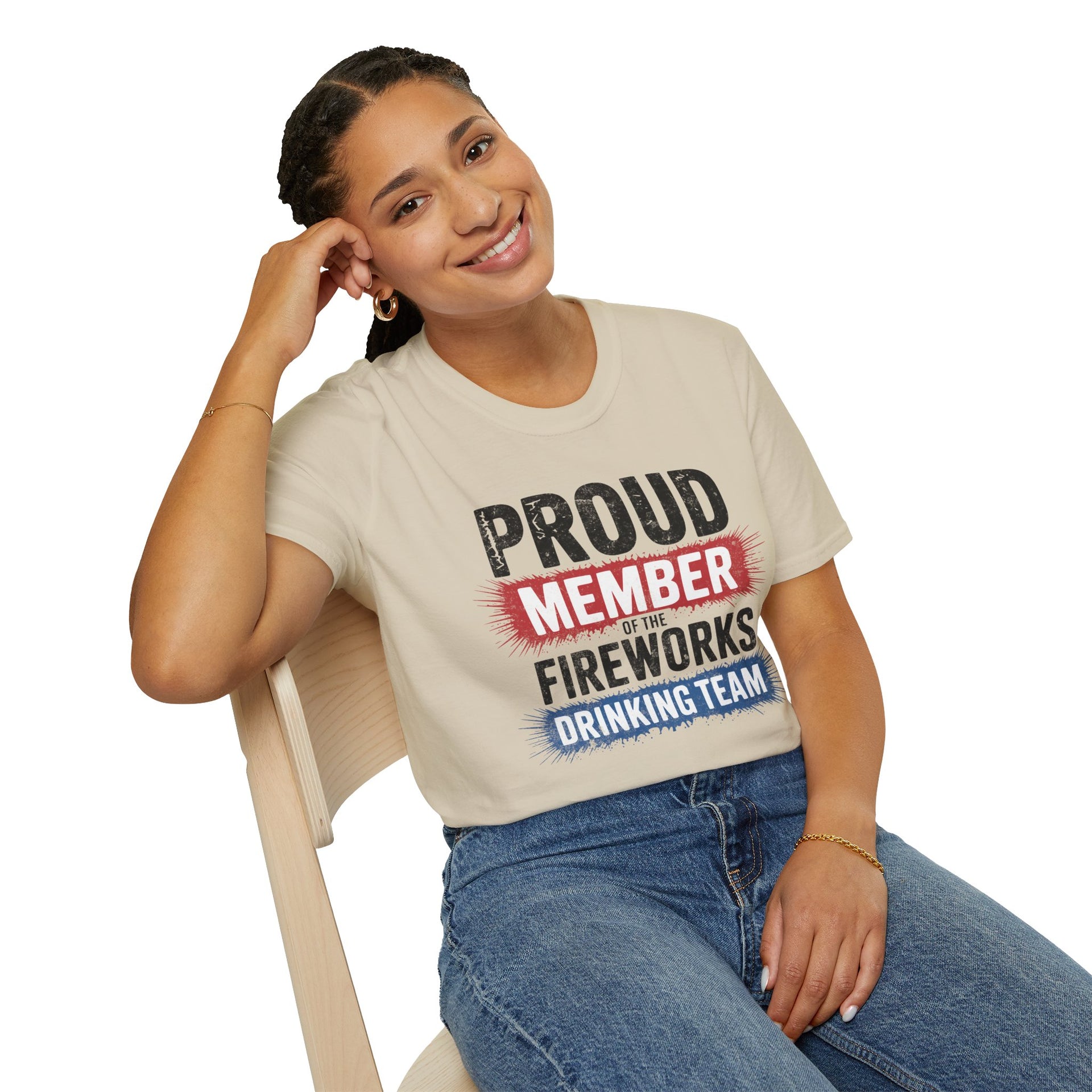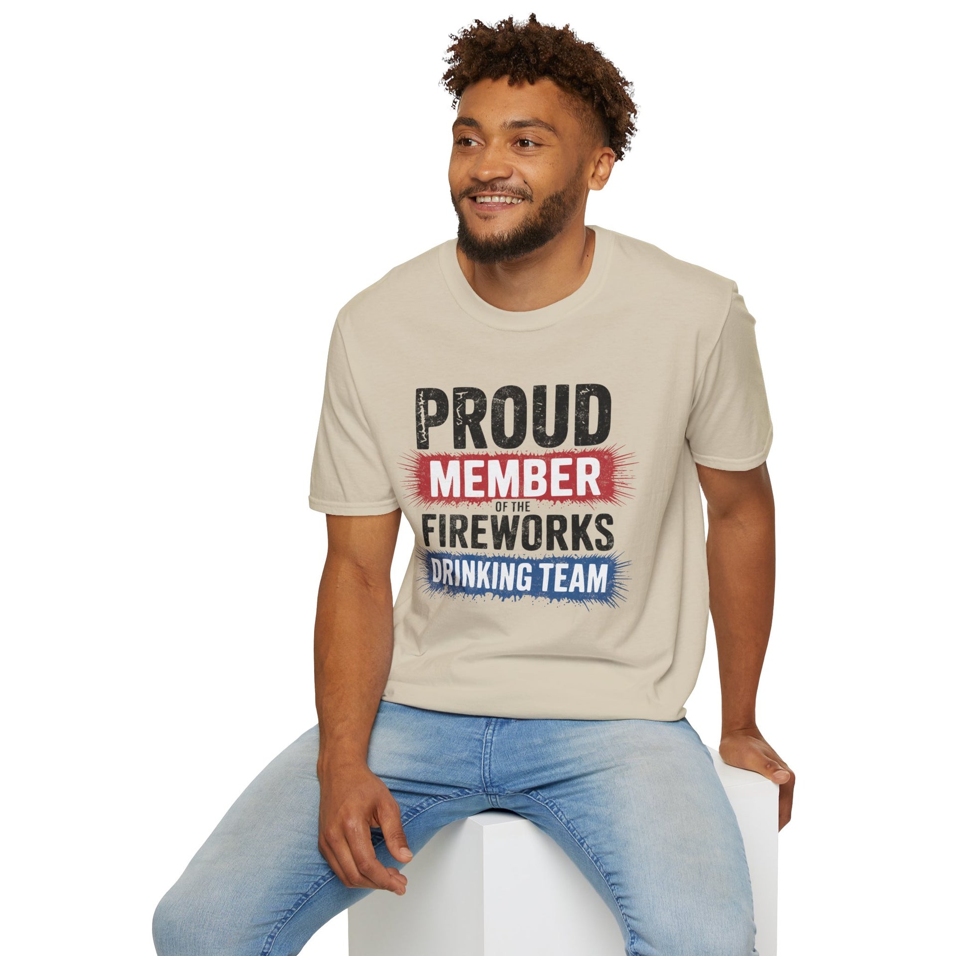 4th of July – Proud Member of the Fireworks Drinking Team – Patriotic Soft Cotton Tee